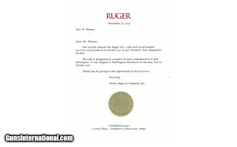Sturm Ruger & Co ~ No. 1B ~ 6mm Remington