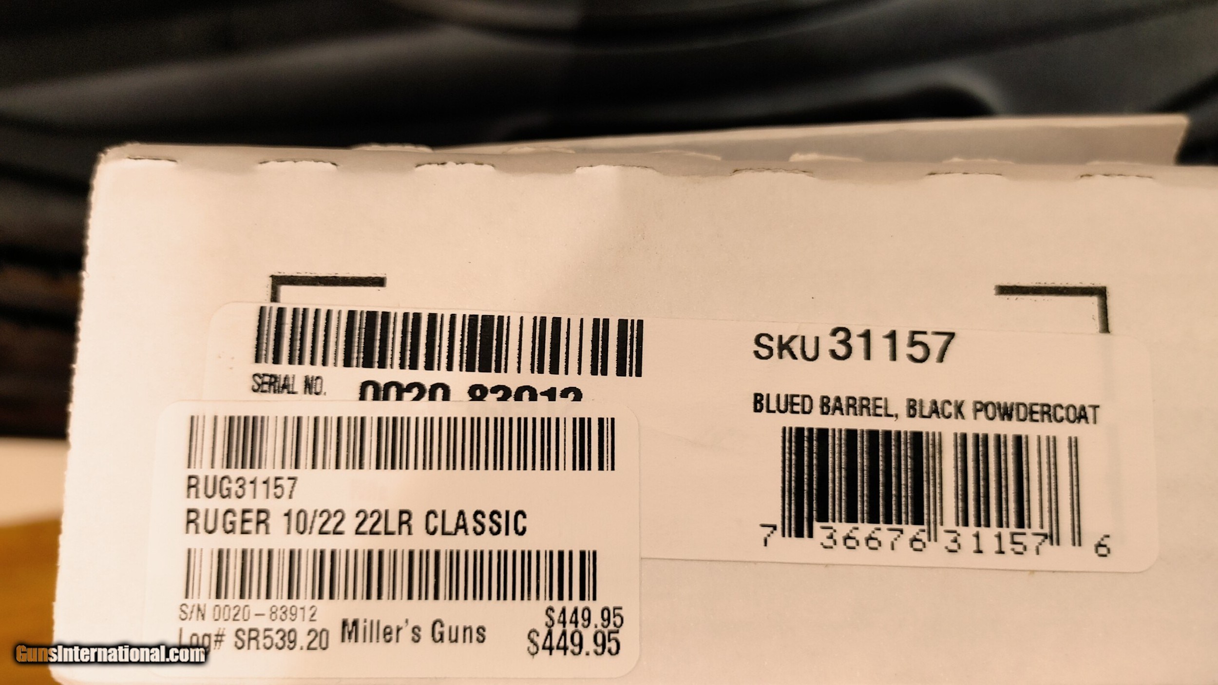 Description: new 10/22 CLASSIC VIII FRCH WAL/SS 31157 AA FANCY FRENCH WALNUT sku 31157 2 in stock (MODEL:10/22 CLASSIC III); (ACTION:SEMI-AUTO); (CAPACITY:10 + 1); (OVERALLLENGTH:35.75); (STOCKFRAMEGRIPS:WOOD STOCK AA FANCY FRENCH WALNUT); (MAGAZINE:1 10 RD.); (RATEOFTWIST:1-IN-16); (BARREL LENGTH:18.5); (DRILL-TAPPED:FALSE); (RIFLE:RIFLE) Buyer pays shipping Millers Gun Center Located in New Castle, Delaware "Home of TAX-Free shopping" No Credit Card Fees SOLD Serial Number: 0020-83912 + 1 more |