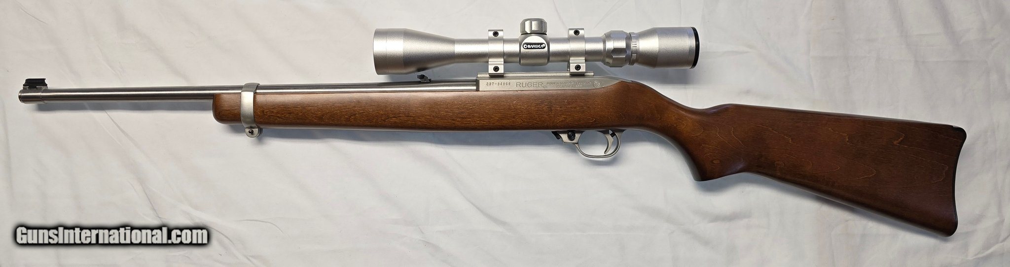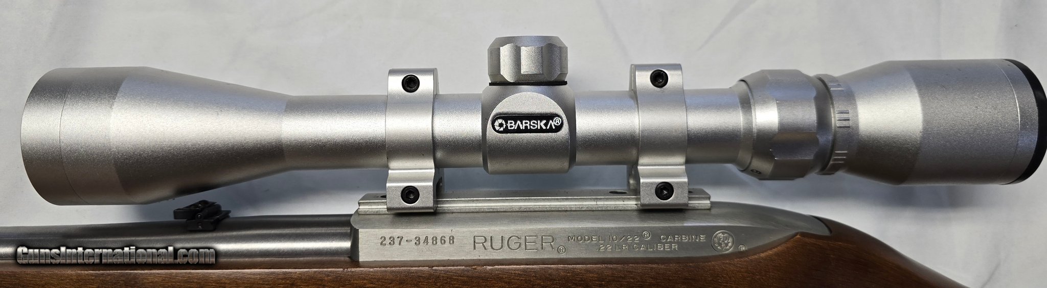 Description: Guns Listing ID: 526993 Super nice early 90‚‚s Ruger 10/22 with stainless barrel, metal trigger guard, nice wood stock, and a matching Barska 3-9x scope. SOLD Manufacturer: RUGER Model: 10/22 Caliber Info: .22 LR Condition: Used - Non-Certified Barrels: 18.5 Action: SEMI AUTOMATIC Finish: stainless with wood stock |