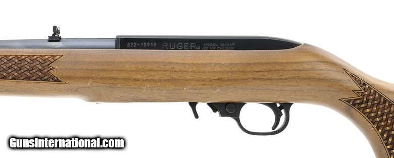 Description: Ruger 10/22 .22LR caliber rifle. Special edition with full length stock and basket weave checkering. The wood has some light marks.