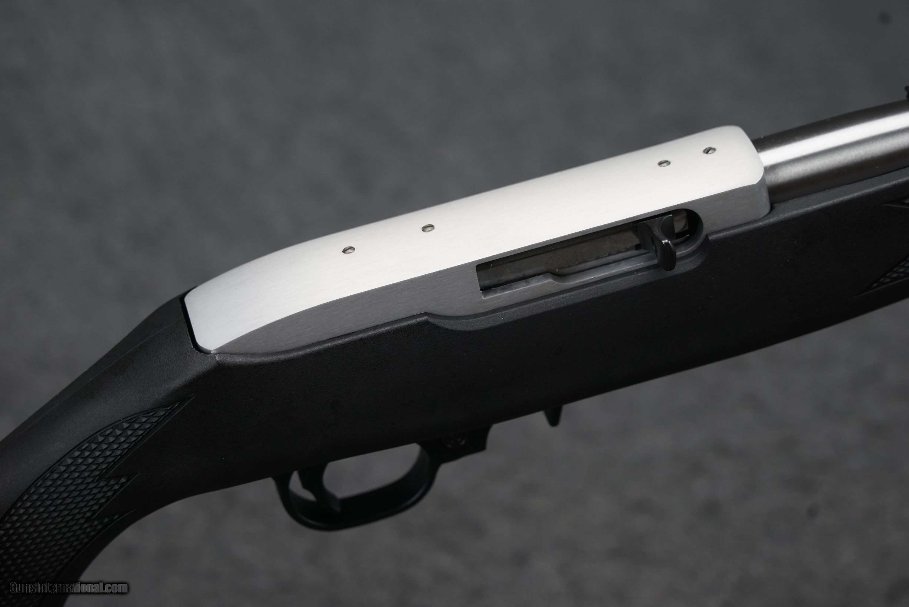Description: This legendary action is a tried and true Ruger design that ensures consistent, reliable performance. Detachable 10-round rotary magazine features a unique rotor to separate cartridges and provide reliable feeding. Easy-to-use, prominent magazine release provides smooth, no-fuss removal of flush-mounted magazine. Cold hammer-forged barrel is locked into the receiver by a unique, two-screw, V-block system. Positive, push-button, cross-bolt manual safety. Combination scope base adapter for both Weaver-style and .22 tip-off scope mounts included. Heat-stabilized, glass-filled, polymer trigger housing assembly is precision made of high-tech material for improved manufacturing tolerances, impact and abrasion-resistance and an unmatched ability to withstand the elements. The receiver and stock combine to create classic lines for attractive styling. StockBlack Synthetic Front SightGold Bead Rear SightAdjustable Barrel MaterialStainless Steel Thread PatternN/A Twist1:16" RH Capacity10 Barrel FinishClear Satin Weight4.4 lb. Overall Length37" Barrel Length18.50" Grooves6 SOLD Rifle Caliber: .22 Long Rifle Manufacturer: Ruger Model: 10/22 Carbine Barrel Length: 18.50" Barrel Condition: BRAND NEW |