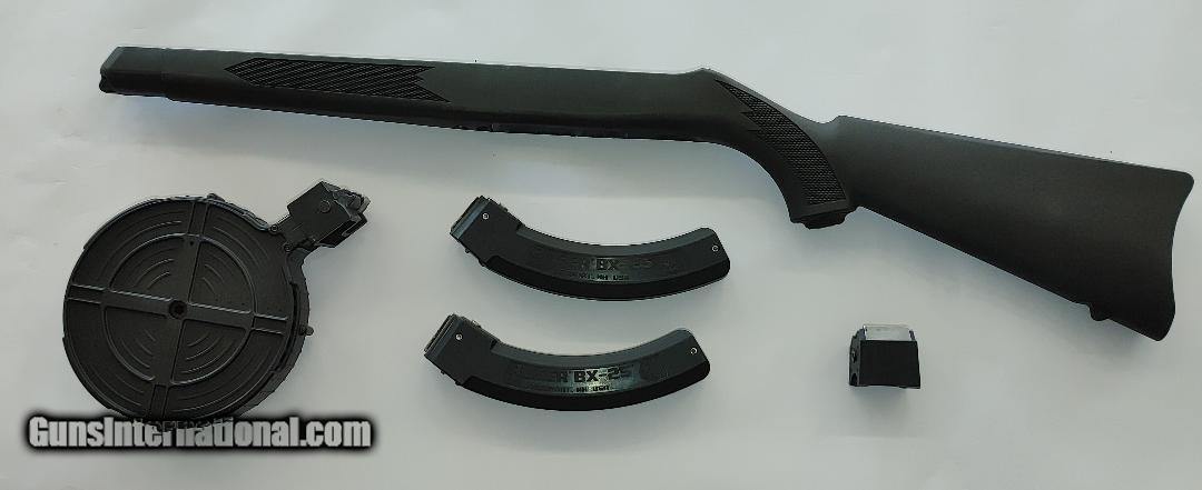 Description: Guns Listing ID: 1332092 Ruger, 10/22 Carbine, Semi-Automatic Rifle, 22 LR, 18.5\" Barrel, Clear Satin Finish, Stainless Steel, Black Synthetic Stock, Adjustable Rear Sight, 4 MAGS FACTORY BOX Cross-Bolt Manual Safety Extended Magazine Release Cold Hammer-Forged Barrel Rotary Magazine ALL ORIGIONAL PARTS FAB DEFENSE AGM 500 FURNITURE WITH FOLDING ADJ STOCK CALDWELL 6\"-9\" BIPOD 4 TOTAL MAGS ONE 10RD, TWO BX-25, ONE 50RD GSG DRUM UPGRADED MUZZLE BRAKE UPGRADED TRIGGER KIT UPGRADED CHARGING HANDLE UPGRADED SPRING KIT Product Description The legendary 10/22 action, a tried and true Ruger design, ensures consistent, reliable performance. An Easy-to-use extended magazine release provides smooth, no-fuss removal of flush-mounted magazines and the Cold hammer-forged barrel is locked into the receiver by a unique, two-screw, V-block system. SOLD Manufacturer: RUGER Model: 10/22 CARBINE Caliber Info: .22 LR Condition: Used - Non-Certified Barrels: 18.5 BARREL |