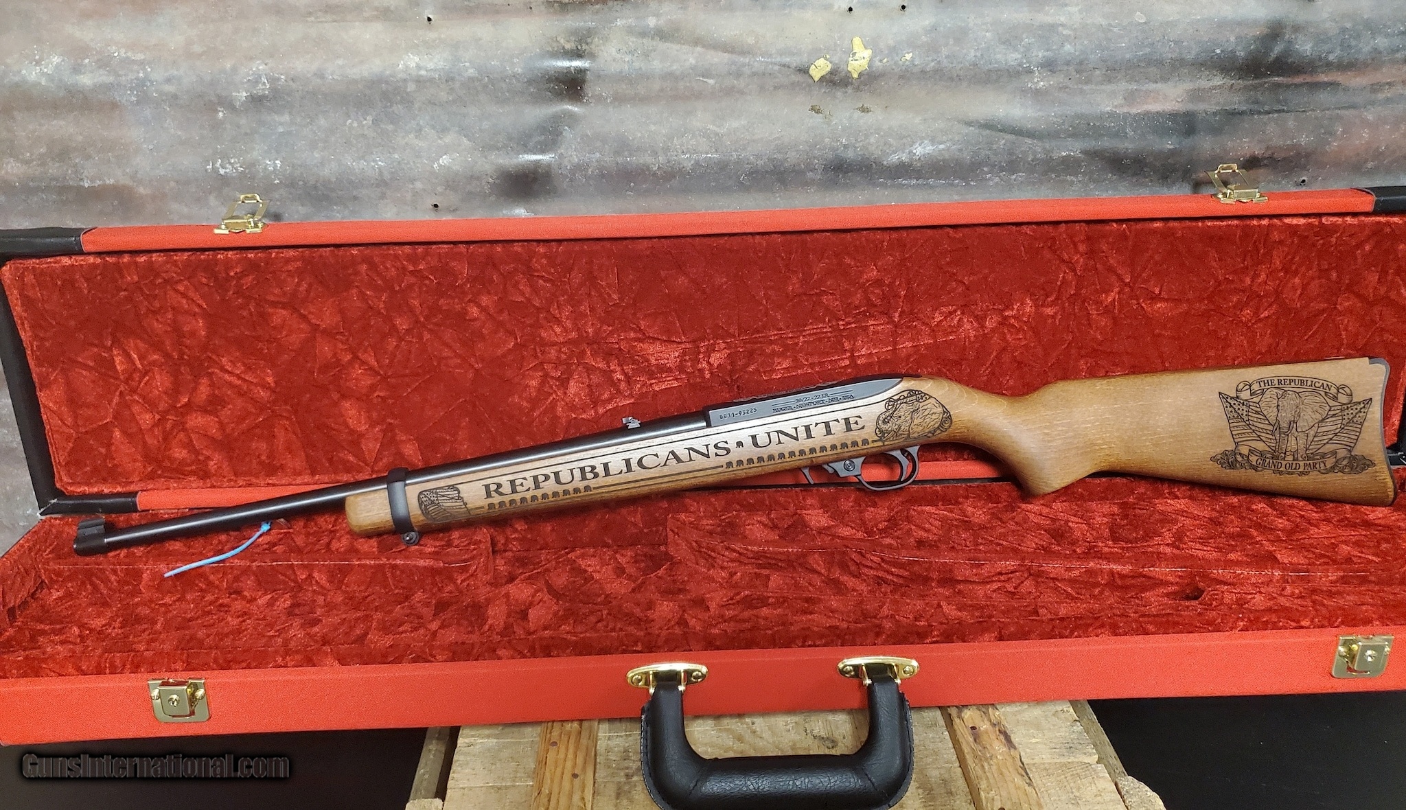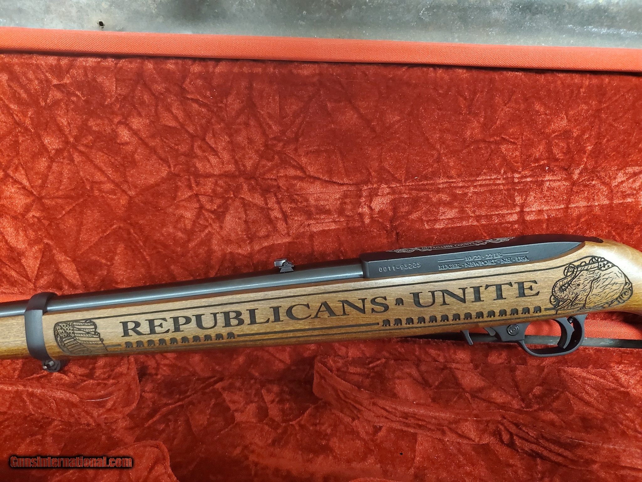 Description: Guns Listing ID: 471817 This is a one-of-one special edition 10/22. Made for the Republican Party of Outagamie County, WI. Comes with a beautiful red velvet lines case. it is quite the collector‚‚s edition SOLD Manufacturer: RUGER Model: 10/22 CARBINE Caliber Info: .22 LR Condition: Used - Non-Certified Barrels: 18.5 BARREL |