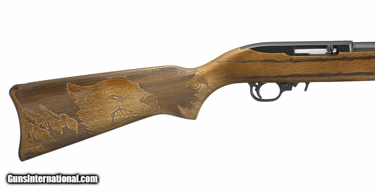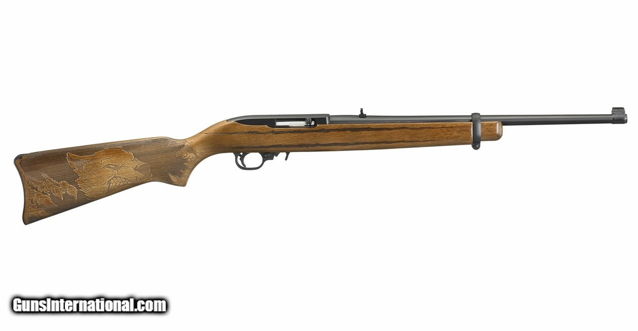 Description: Manufacturer: Sturm Ruger & Co. Model: 10/22 "Wolf" - TALO Exclusive SKU: 31135 Caliber: .22 LR Capacity: 10 Rounds Barrel Length: 18.5" Material: Alloy Steel Finish: Satin Black Stock: Beech, Engraved Wolf Weight: 4.9 lbs Twist: 1:16" RH Sights: Gold Bead - Front, Adjustable - Rear Overall Length: 37" Ruger & Talo have once again knocked it out of the park with their exclusive 10/22 with an Engraved Wolf Beech Stock. Other features include a gold bead front & folding rear sight, 2-position crossbolt safety, and a 10 round magazine.