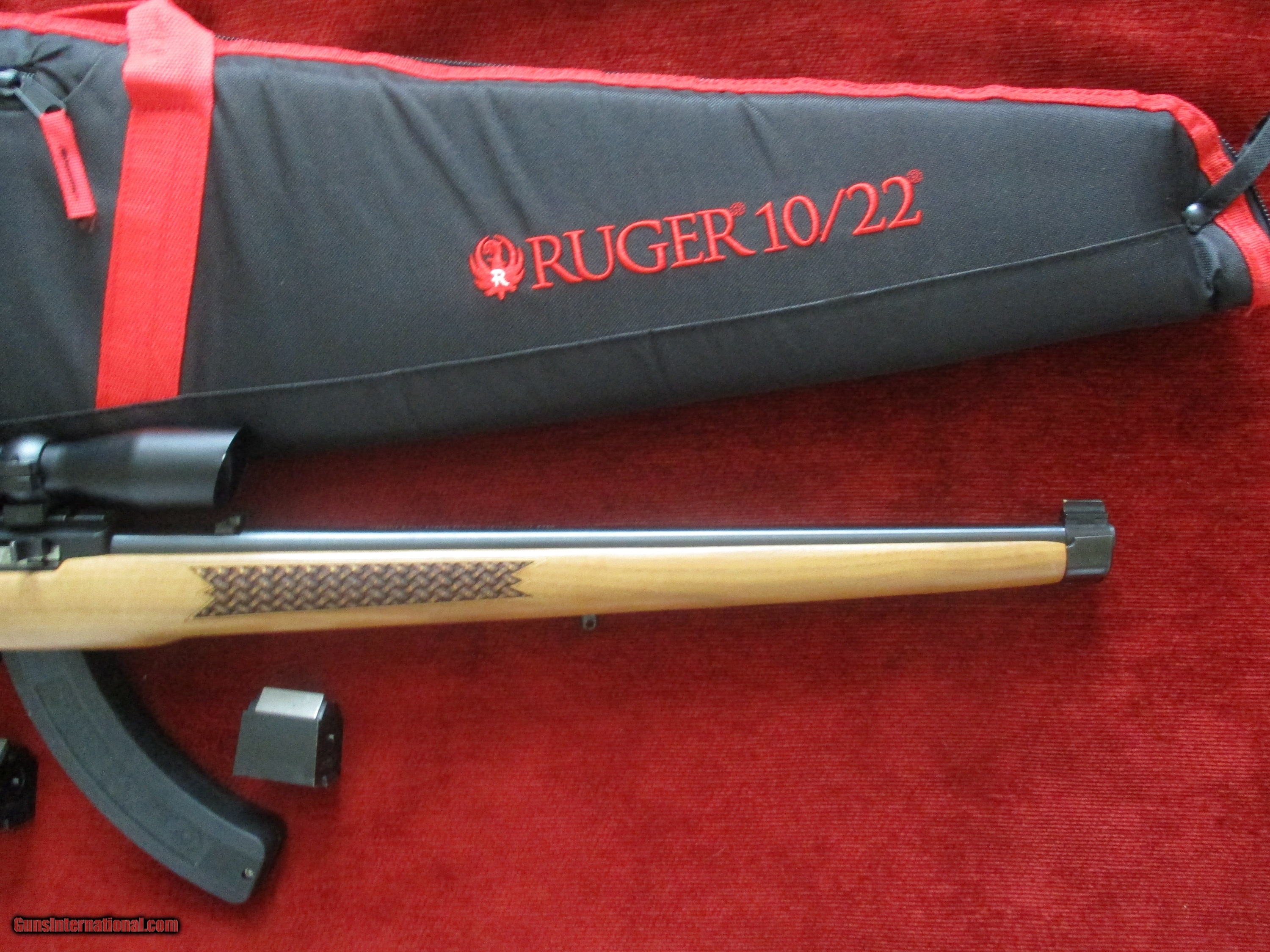 Description: 18 1/2" bbl., mannlicher stock with forend steel band,thisb is a special run with fancy maple with basketweave checkering, Monte Carlo cheekpiece, 3 mags including (2) 10 rd, & (1) 25 rd. magazine, Picatilly baswe, Weaver rings, 4X Tru-Glo Widw angle scope, also has 3 pocket Ruger 10/22 red & black field case, as new, all paperwork including manual, warrenty & more SOLD |