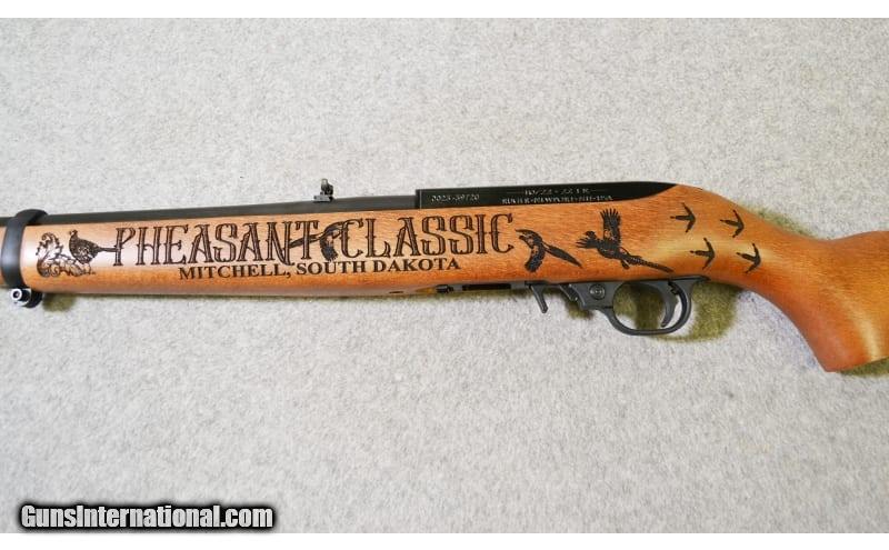 Description: This rifle is #4 of 10 specially engraved for the 2023 South Dakota Pheasant Classic. The condition of the gun is new and has not been fired. It would be a great gun in any Ruger collection and a great reminder of a wonderful hunt in South Dakota. .22 Long Rifle SOLD Chambers: 22 Long Rifle Metal Condition: NIB Wood Condition: NIB Barrels: 18 Inches Triggers: Factory Stock Dimensions: 13 1/2 Inch LOP Fore End: Engraved Wood Butt Pad: Black Composite Weight: 5 lb Sights: Factory Item Location: Mitchell, SD |