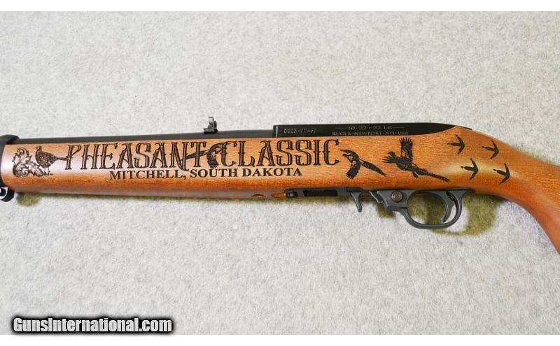 Description: This rifle is #5 of 10 specially engraved for the South Dakota Pheasant Classic. The condition of the gun is new and has not been fired. It would be a great gun in any Ruger collection and a great reminder of a wonderful hunt in South Dakota. .22 Long Rifle SOLD Chambers: 22 Long Rifle Metal Condition: NIB Wood Condition: NIB Barrels: 18 Inches Triggers: Factory Stock Dimensions: 13 1/2 Inch LOP Fore End: Engraved Wood Butt Pad: Black Composite Weight: 5 lb Sights: Factory Item Location: Mitchell, SD |