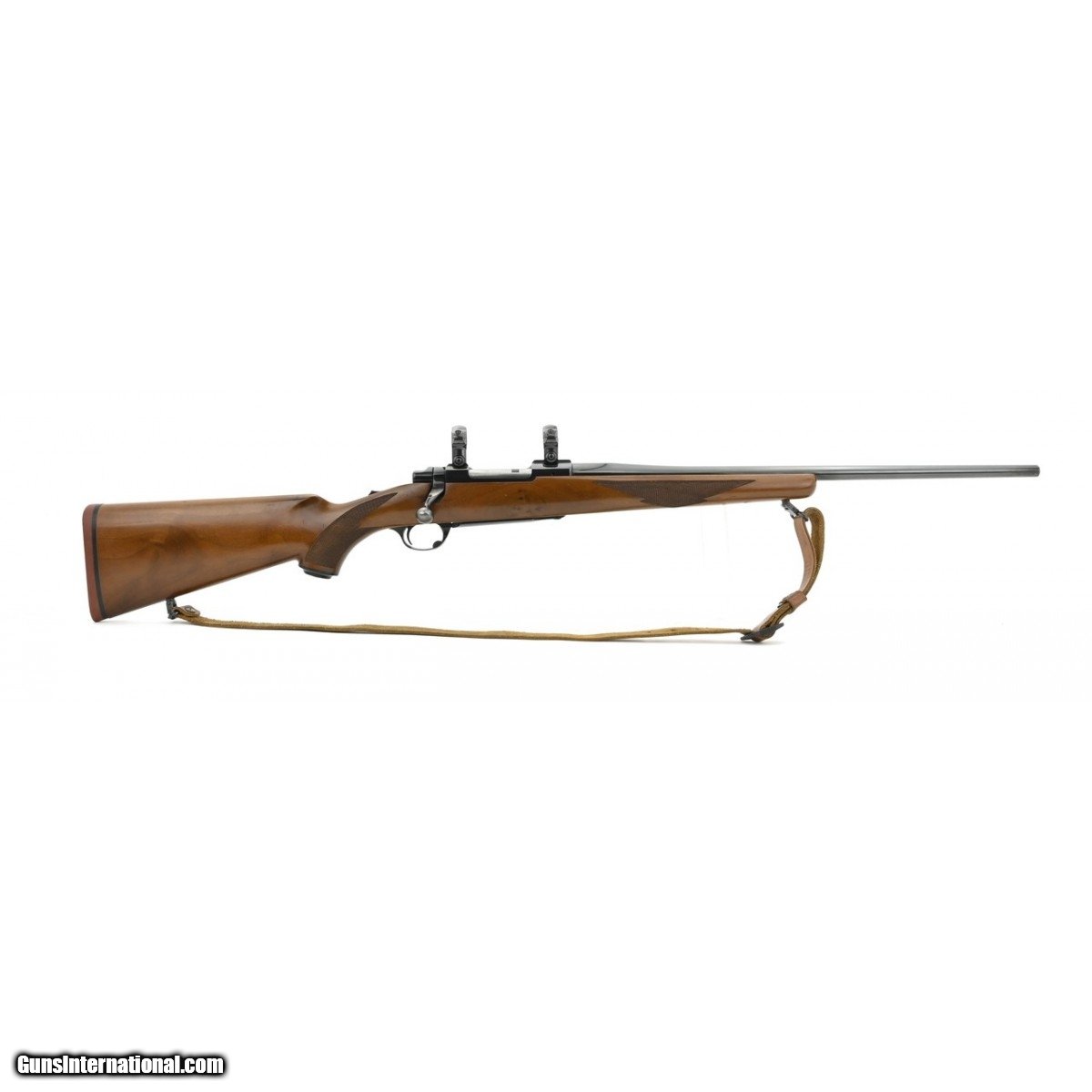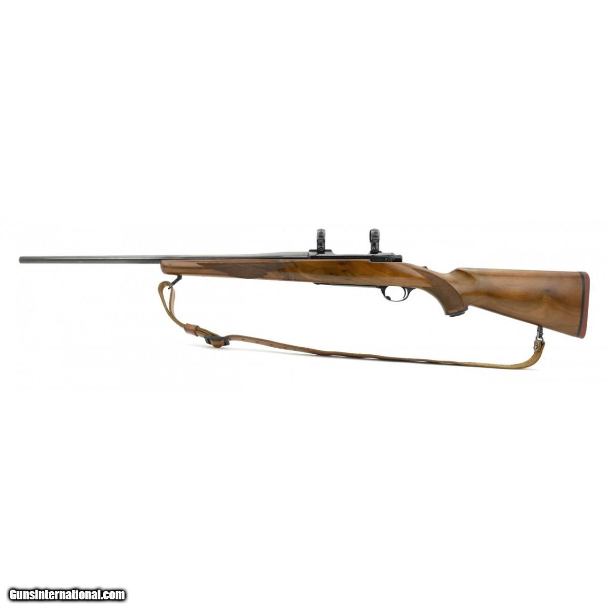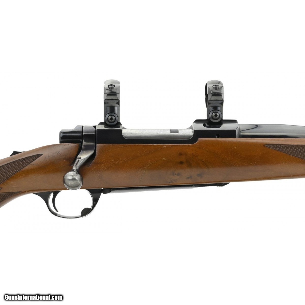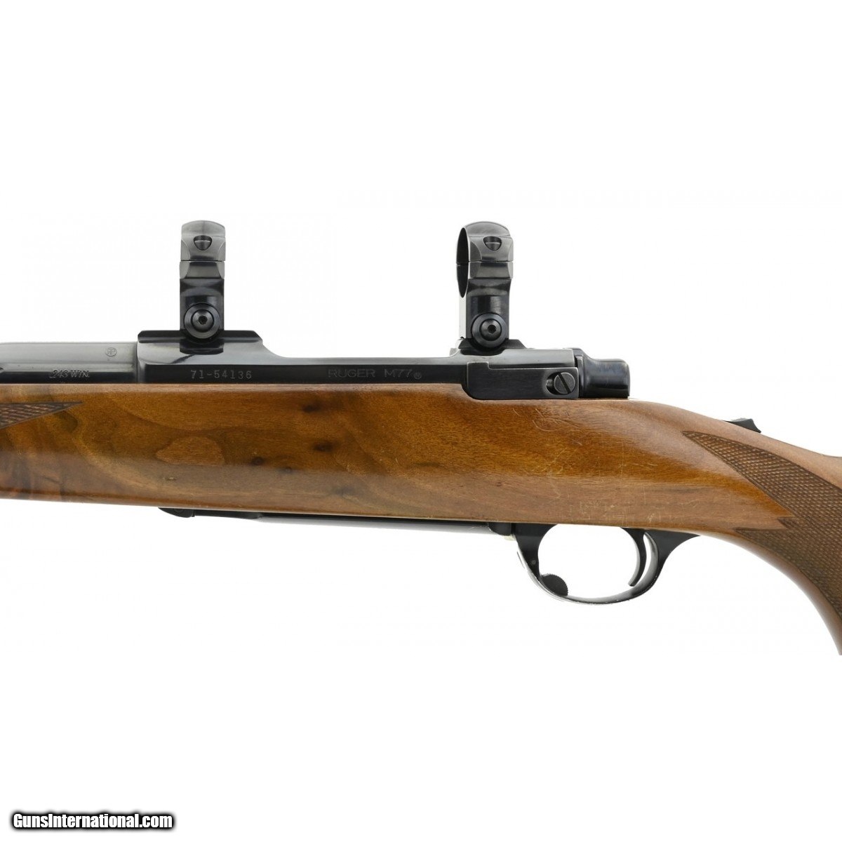 Description: " Ruger M77 243 Win caliber rifle. Early model with Tang safety, with scope rings. The metal is excellent, the stock has marks.