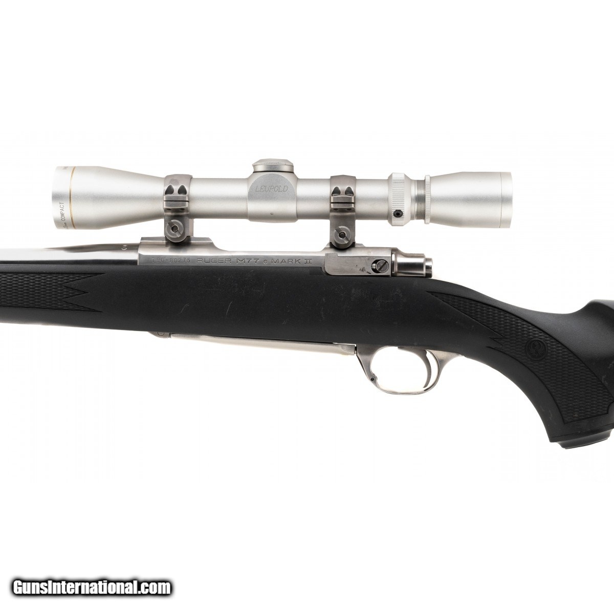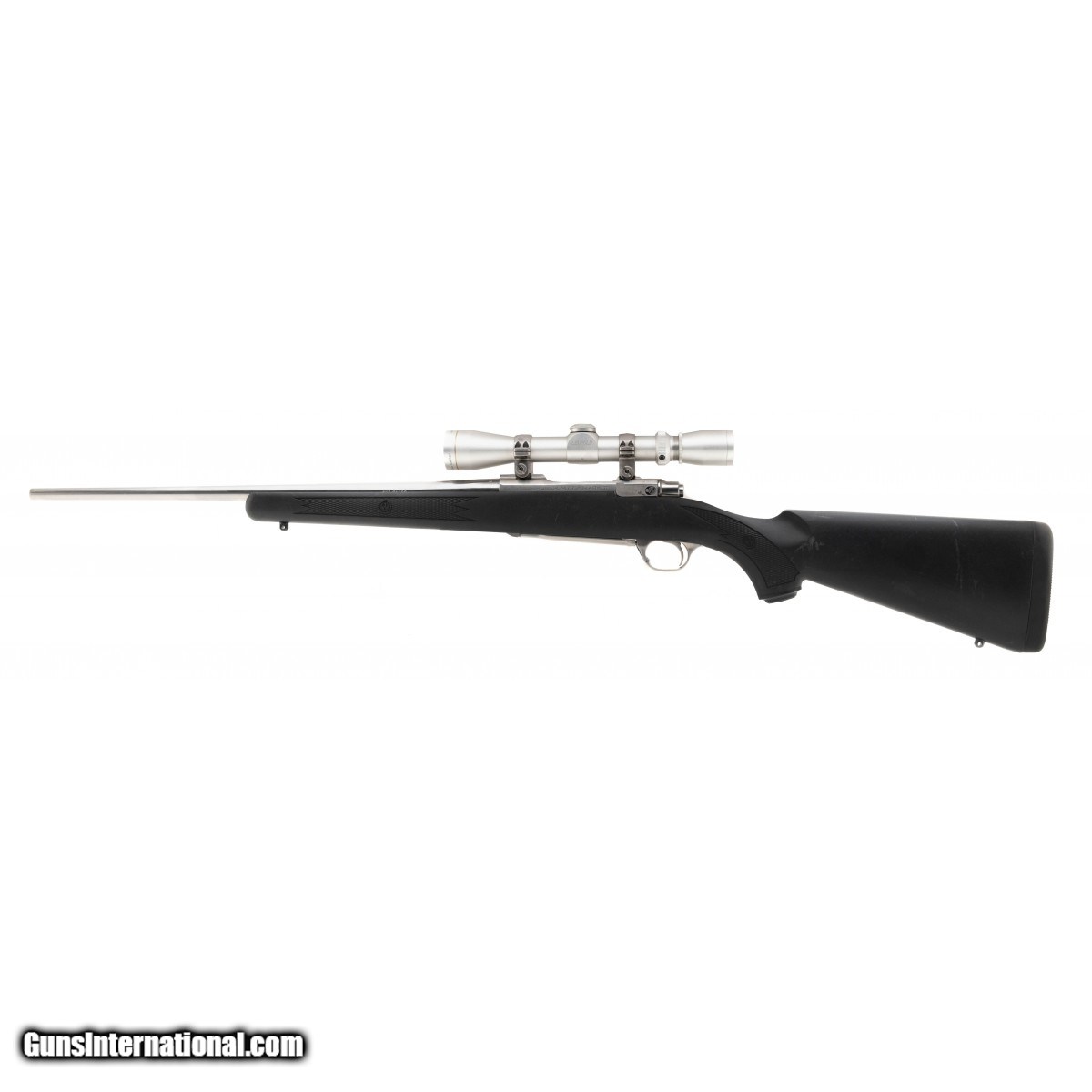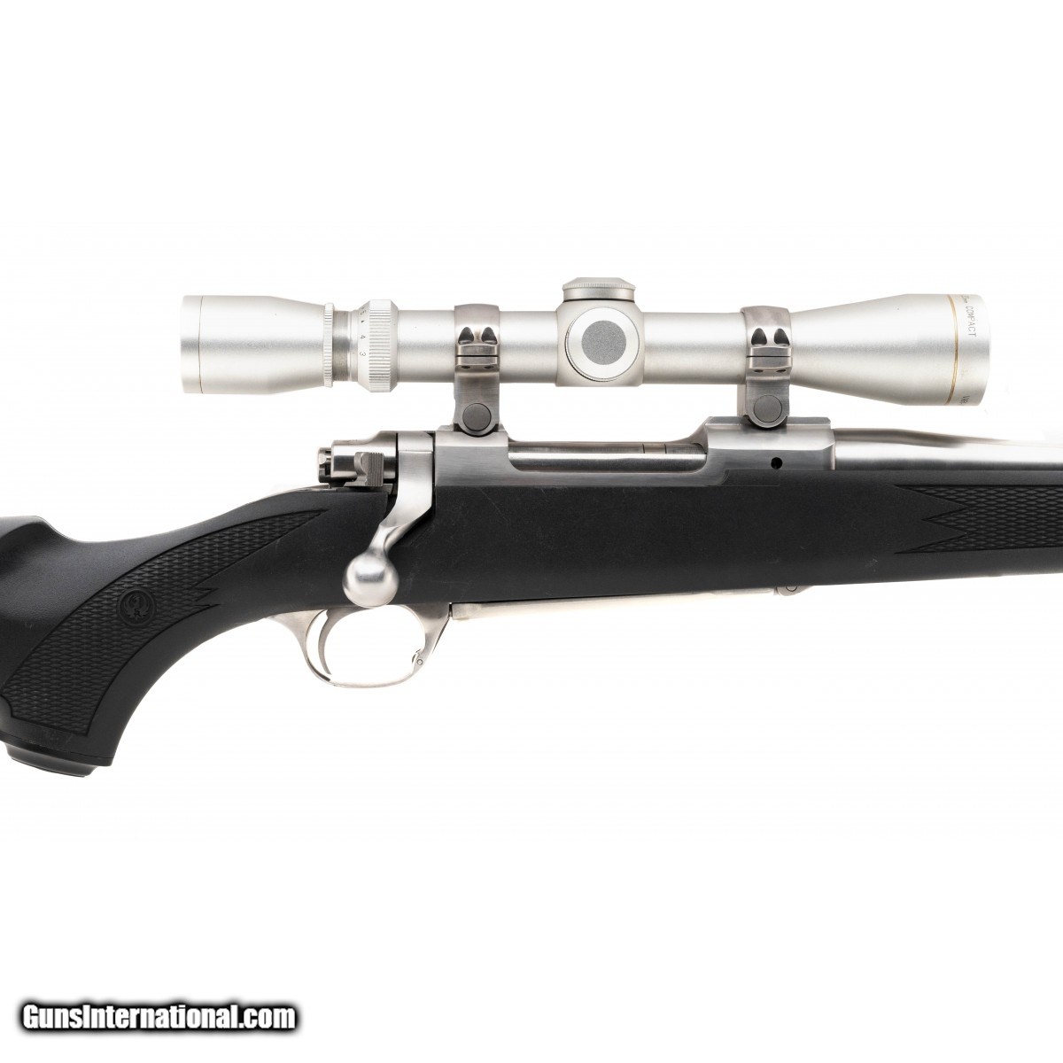 Stainless steel carbine with 20"" barrel and synthetic stock. Has a Leupold 3x9 Compact scope. The metal is excellent condition, the stock shows wear and marks.