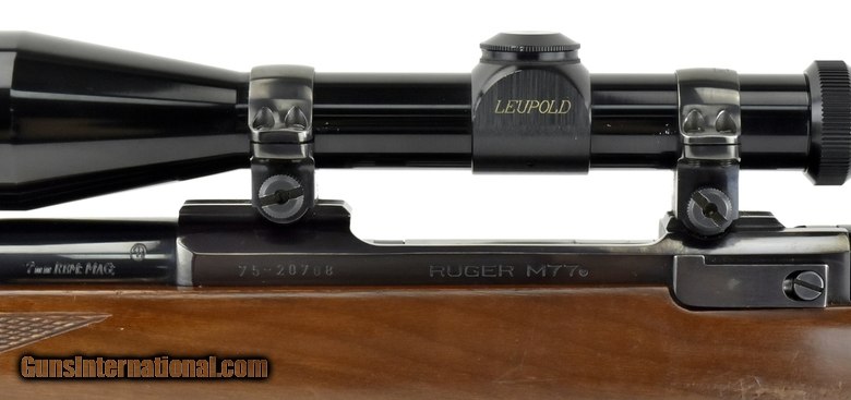 Ruger M77 7mm Rem Mag caliber rifle. Early model with tang safety. Has a Leupold 3x9 scope. Very good condition with light wear.