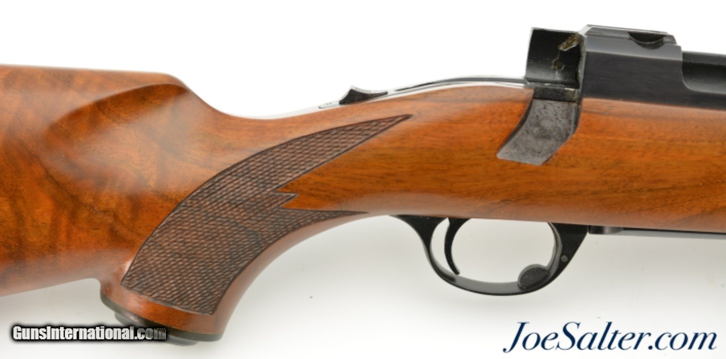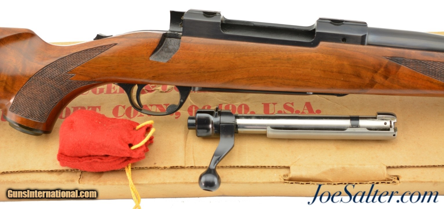 Description: Serial #70-35383, .30-06, 22" barrel with an excellent, bright bore. This is a 1974-made rifle that retains practically all of the original blue finish on the metal, with the exception of the hollow bolt handle which has some minor oxidation on the interior. The beautifully figured, checkered walnut stock has virtually no wear or handling marks, and is outfitted with a red Ruger recoil pad. The rifle is housed in the original, numbered Ruger cardboard shipping box with scope rings, and is also accompanied by a 2022-dated Ruger factory letter that lists a shipping date of January, 1974 to Jerry’s Sport Center of Olyphant, PA. This is a practically new-in-box, early Model 77, and would make a stellar addition to any collection. FFL or C&R SOLD Curio/Relic: Yes |