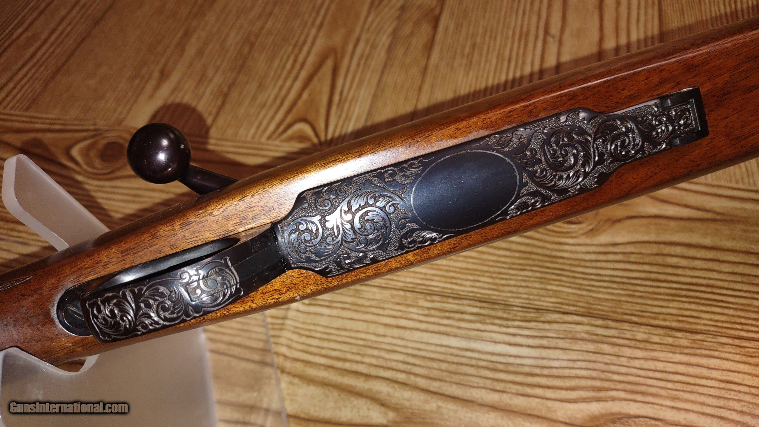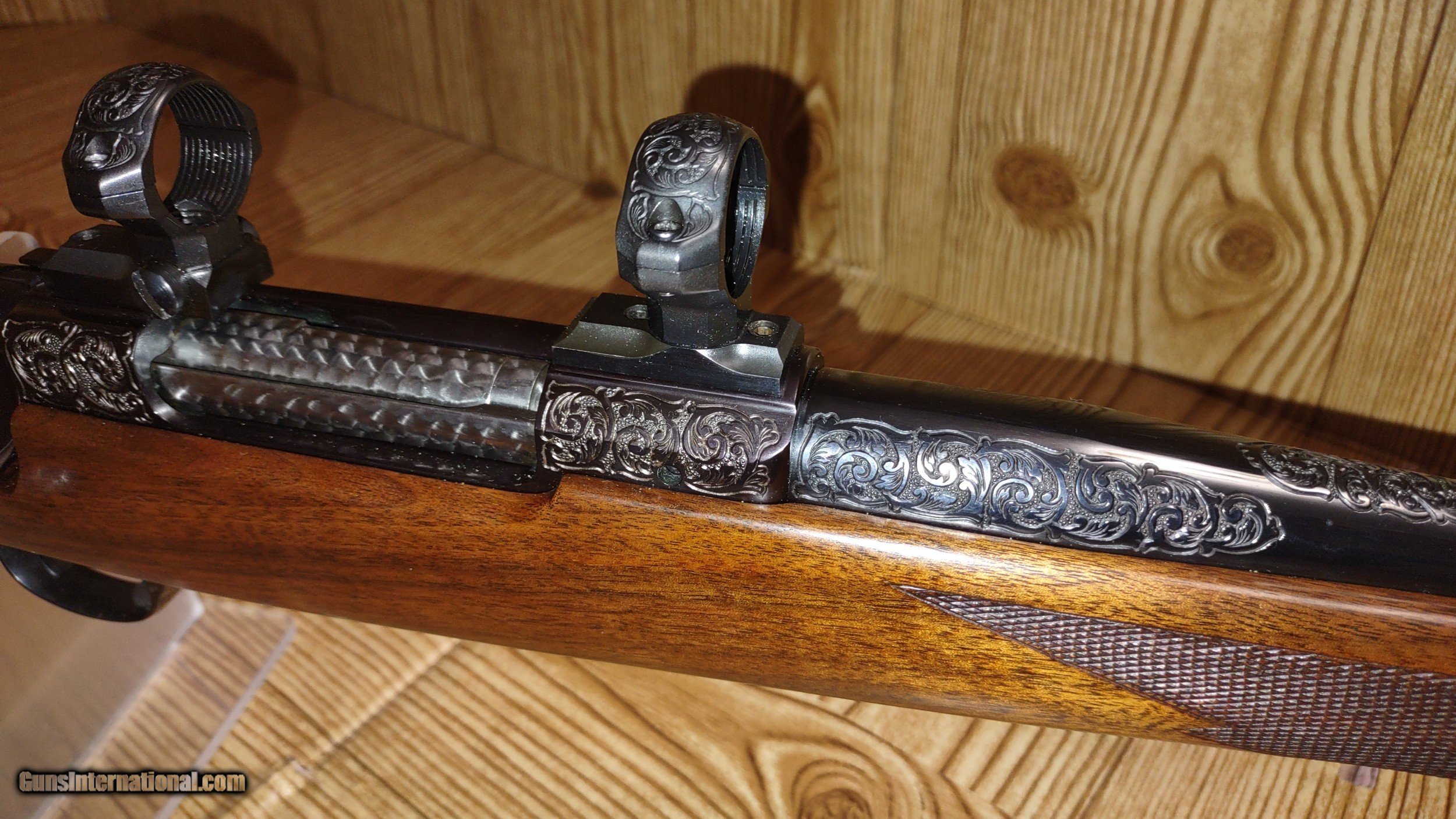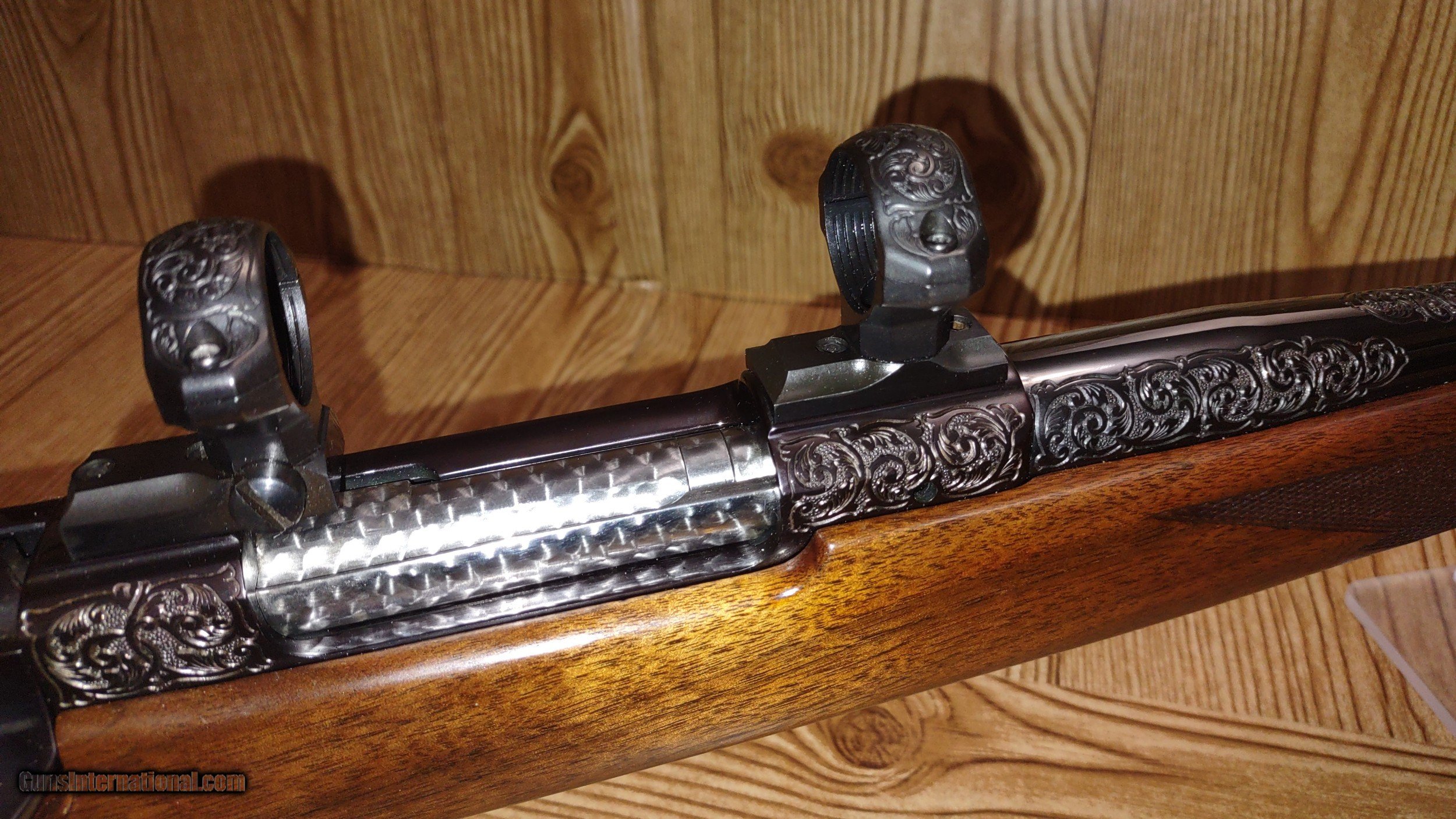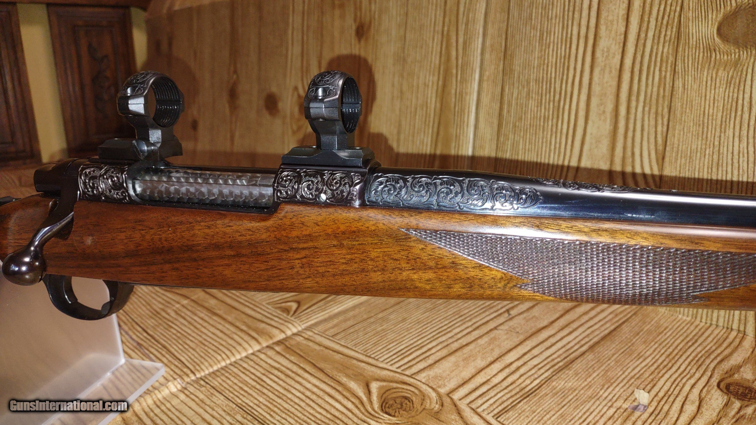 Description: We’re proud to offer an exquisitely engraved Ruger M77 chambered in 30.06 in excellent condition. Built on a 1978 Ruger M77 receiver and barrel chamber in 30.06 The receiver and barrel exhibit a gloss black bluing with right and left side engraved receiver and barrel. Engraved with a deep rich scroll pattern. The bore rates as excellent. Barrel is 22 inches. Jeweled bolt and bolt release. 1 inch off-set scope mounts present with engraved ring caps. An exquisitely engraved hinged floorplate and trigger guard with a release inside trigger guard. An adjustable trigger present. Straight grain walnut stock figuring with pistol grip and forearm checking with black decelerator recoil pad. A hand rubbed satin finish. It's hard to find such high quality Ruger M77' and will make fine addition to any collection and incite envy from your hunting buddies. Thank you ed. Ships in new hard case fully insured CC fee 3.5. Thank you Ed SOLD Rifle Caliber: .30-06 Springfield |
