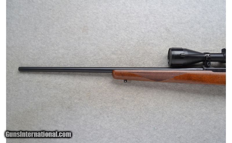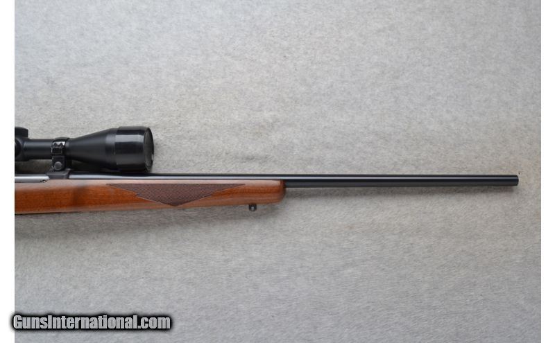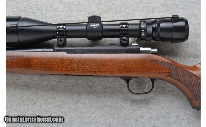 Description: This Ruger Model 77/17 is a right hand bolt action rifle in .17 HMR Cal. It has a 22 inch barrel. No iron sights. It is outfitted with a Swift 3.5x-10x Scope. The stock is a checkered walnut pistol grip with a black ruger cap. This rifle is in excellent condition. SOLD Caliber Info: .17 HMR Chambers: Bolt Action 9 shot rotary magazine. Metal Condition: Excellent. Wood Condition: Excellent with a couple of minor handling marks. Bore Condition: Excellent. Barrels: 22 inch blued barrel. Triggers: Stainless steel. Stock: Checkered walnut pistol grip with a black Ruger cap. Stock Dimensions: LOP 13 5/8 inches. Fore End: Checkered grip walnut. Butt Pad: Ruger black rubber pad. Weight: 7 lbs. 8 oz. with Scope mounted. Sights: Swift 3.5x-10x Scope. No iron sights. Extras: Comes with a Swift Scope and sling swivel studs. Item Location: Richfield, WI |