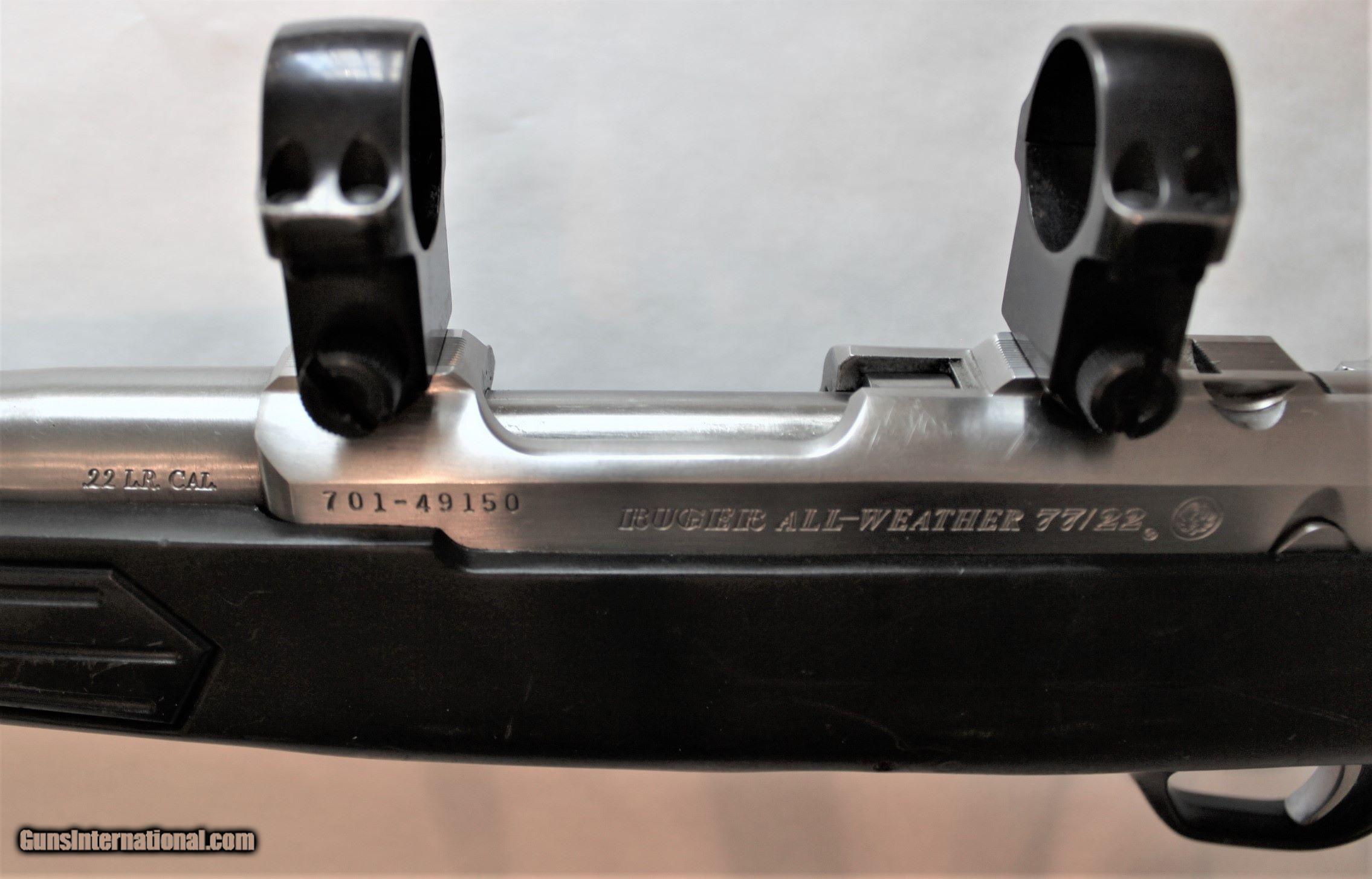 Description: Ruger All-weather 77/22 Stainless bolt-action Zytel stock. 10 shot rotary detachable magazine Firearms shipped to FFL dealers ONLY SOLD Manufacturer: Ruger Model: 77/22 Serial Number: 701-49150 Caliber Info: .22 LR Condition: Used, normal wear Metal Condition: Normal wear. Minor scratches toward the end of the barrel Wood Condition: Good, slight scratches Bore Condition: Very good Barrels: 20 Action: Bolt Rifle Triggers: Standard Stock: Black DuPont Zytel Synthetic stock Sling swivels Fore End: Black texture Finish: Stainless Sights: Scope rings |
