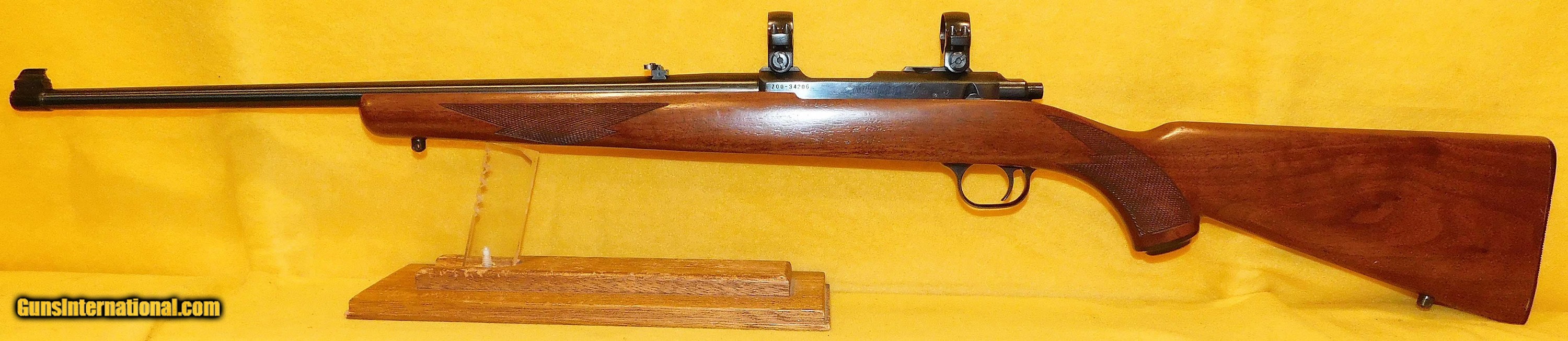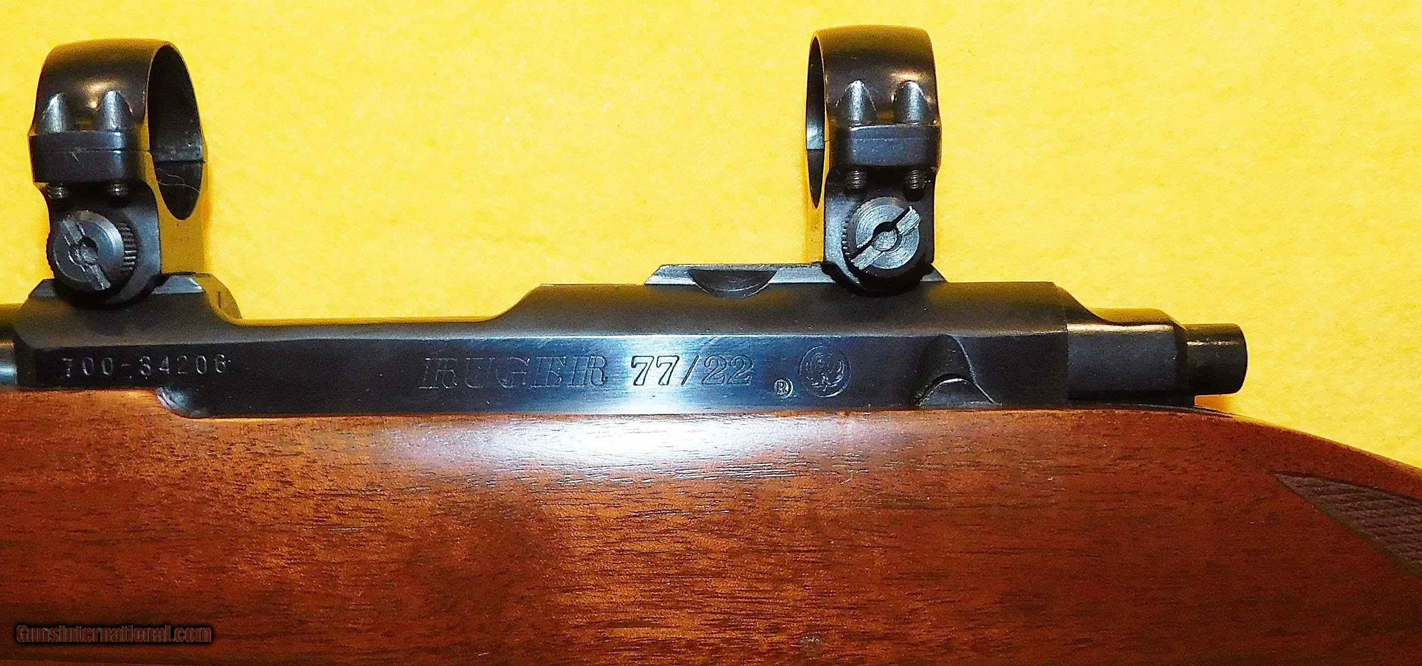 Description: RUGER 77/22 IN .22 CAL., WITH 20" BARREL. COLOR BLUE. CONDITION 96%+. SERIAL NUMBER 700-34206. RUGER MODEL 77/22 IN .22 L.R. CALIBER, BRIGHT SHINY BORE, CHECKERED WALNUT STOCK, WITH FACTORY RINGS, 96%+ OVERALL CONDITION, OUR STOCK # D2906 SOLD |