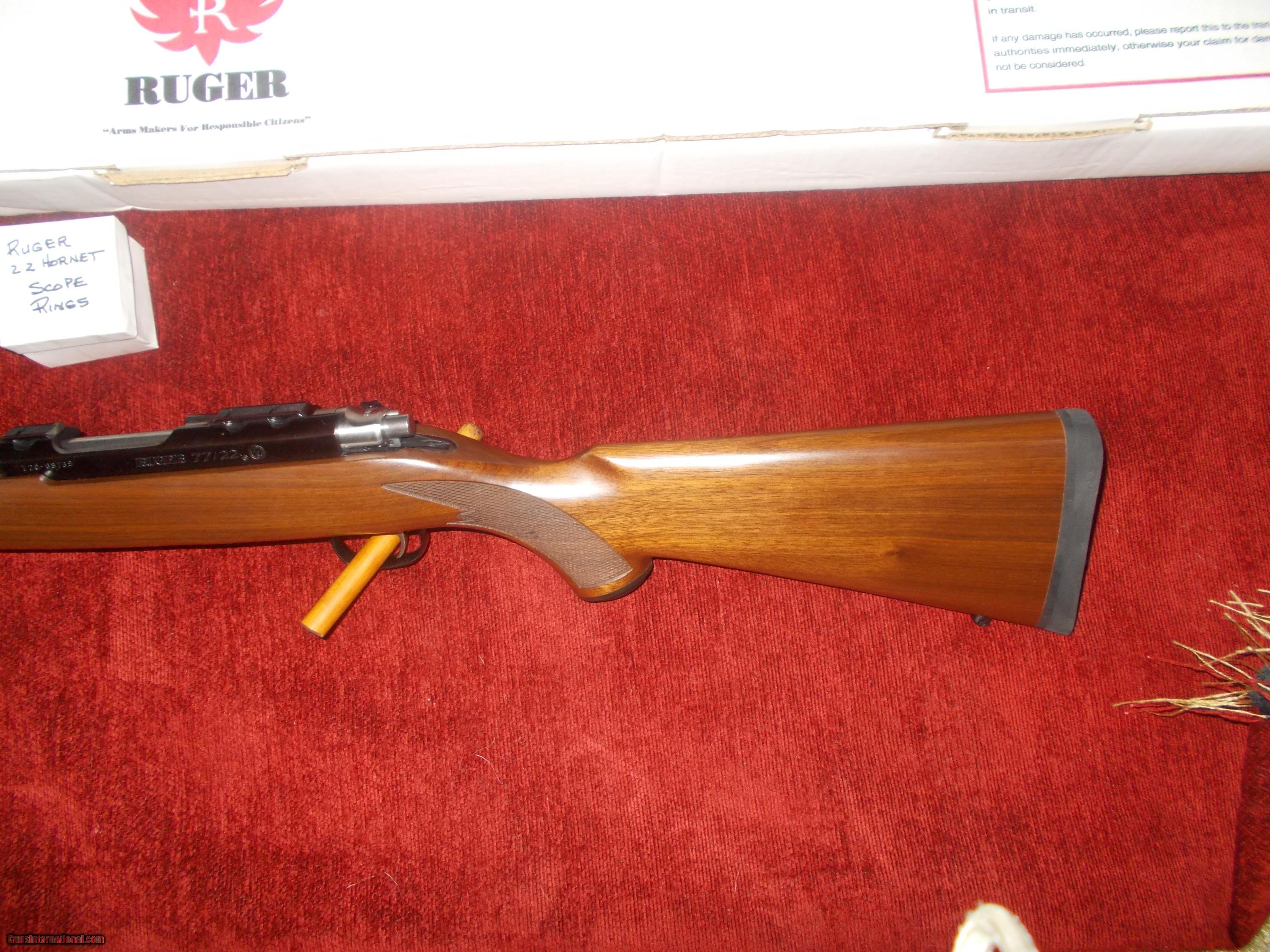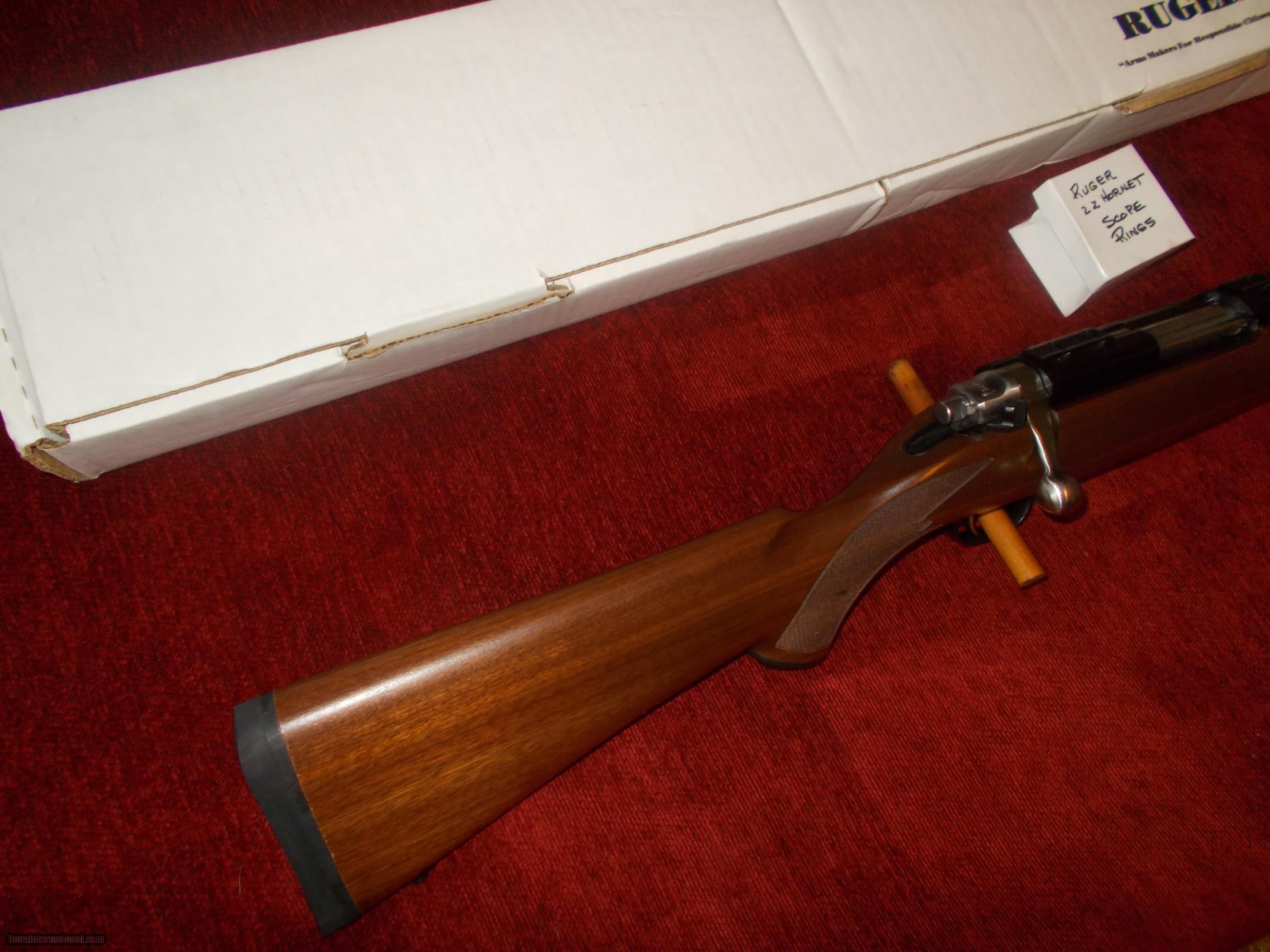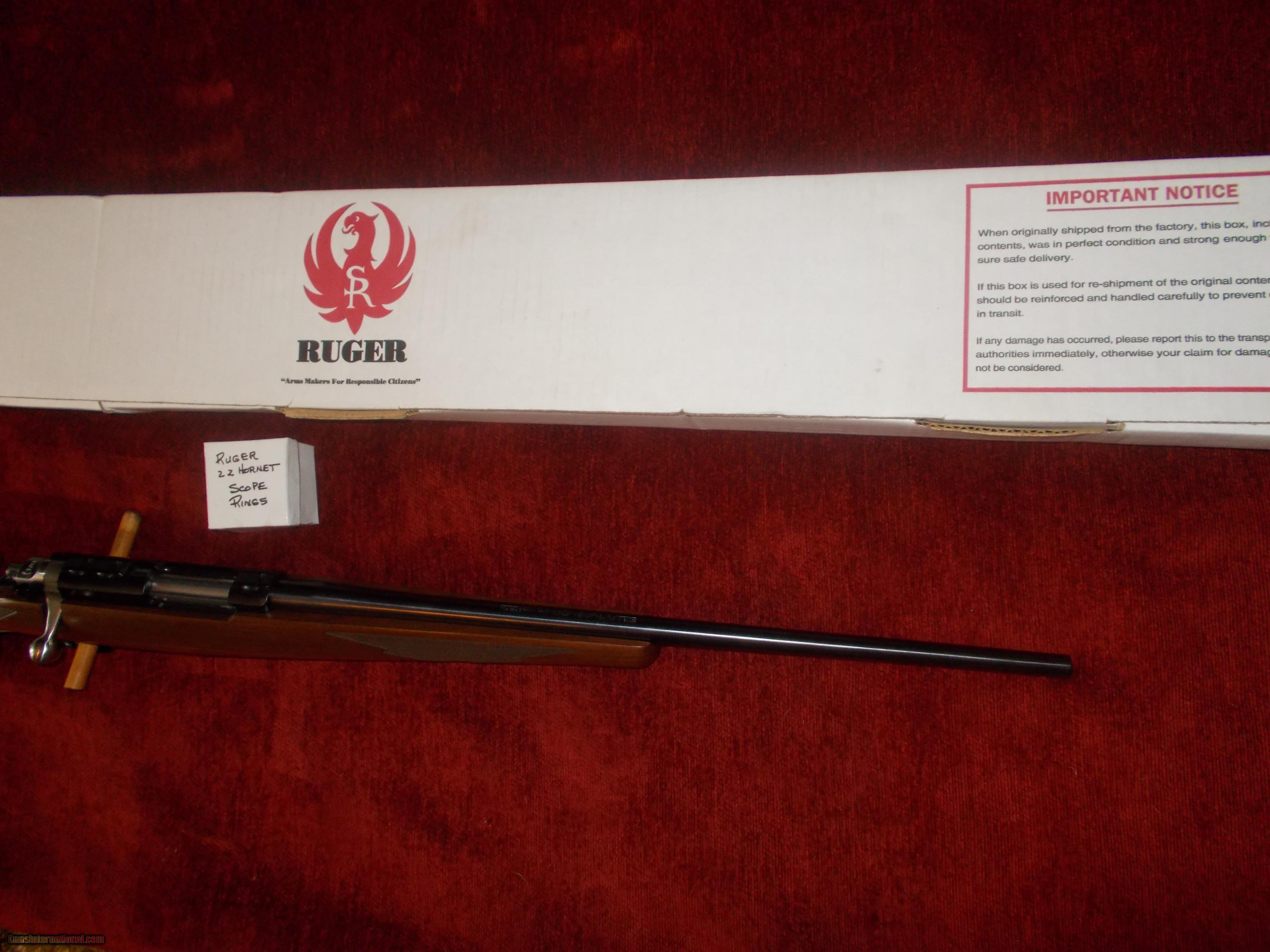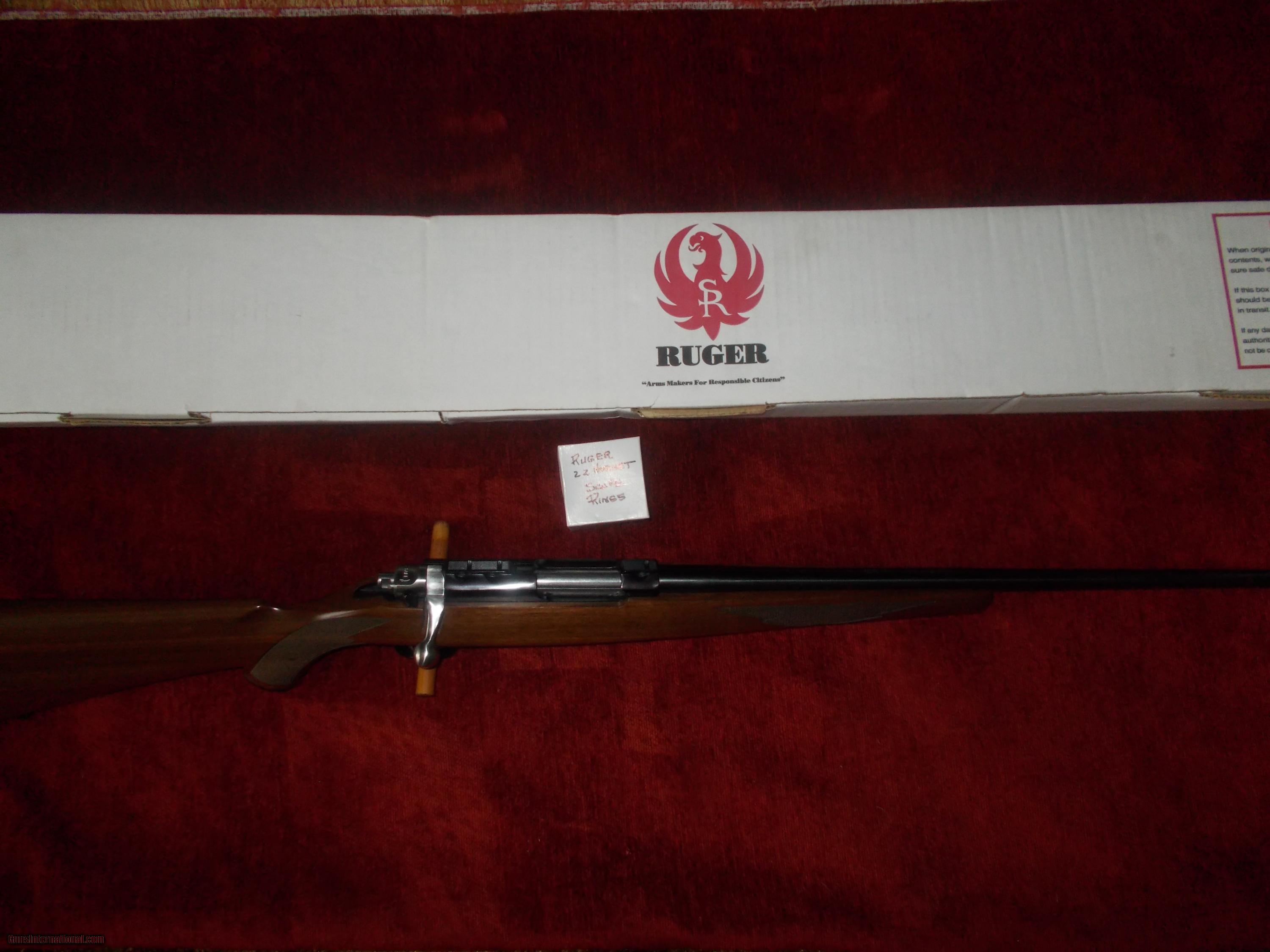 Description: 19 1/2" sporter bbl., Ruger rings, oil finished, hand checkered, deluxe grade American walnut stock, facyory 5/8" solid black pad, ANIB, manual, no deductions! SOLD |