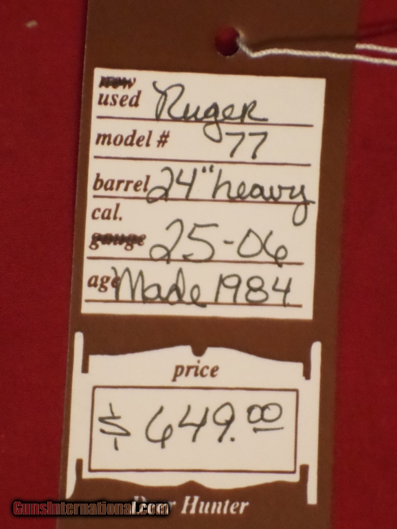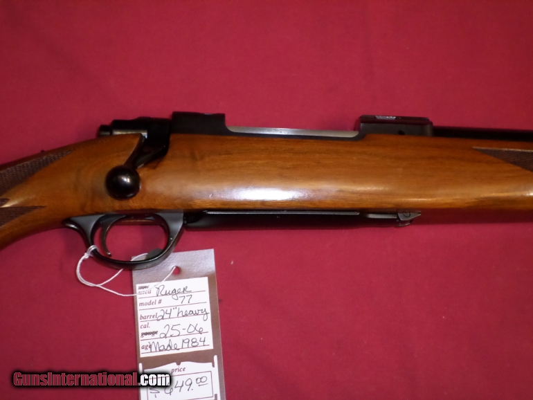 Description: SOLD For sale, Ruger 77 heavy bbl, .25-06, 24" bbl. Factory drilled and tapped, very good condition, circa 1984. SOLD To see more of our inventory, visit deerhunterguns,com We accept MC, Visa and Discover, no AmEx. No Sales to California. Like us on Facebook: Deer Hunter Guns SOLD |