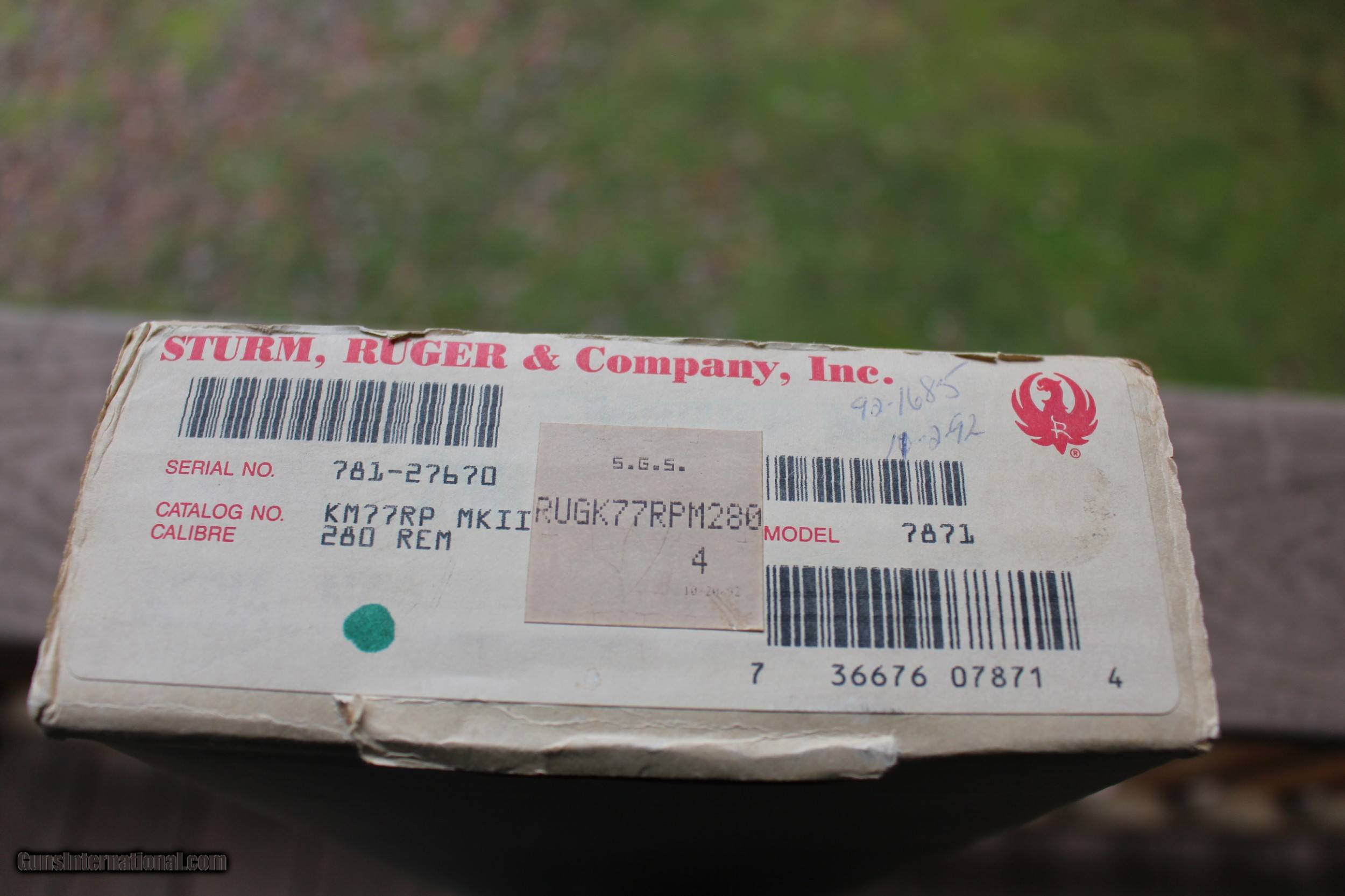 Description: Ruger 77 with Zytel stock...Excellent condition in original box...Muzzle has been profesionaly ported...Rare 280 Rem caliber....Bore shines...Pay Pal useres add 3%...Any questions please call or e-mail SOLD |