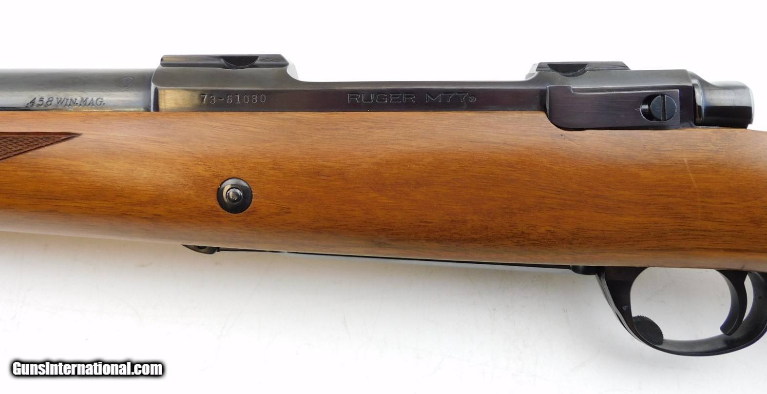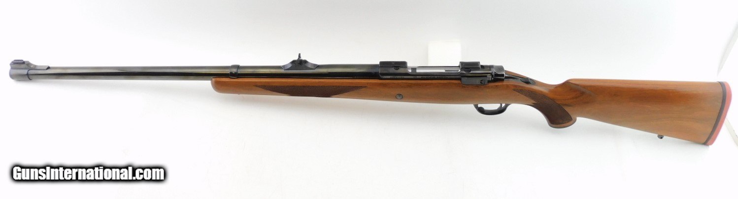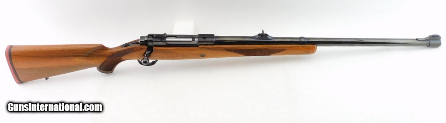 Description: Ruger 77RS - African .458 WINMAG, 24" bbl, bright shiny bore, good rifling, blued finish, notch rear sight, brass bead front sight, very nice checkered grip stock, LOP - 13 5/8", sling studs, and red Ruger recoil pad. Includes 3 boxes of ammunition containing a total of 29 reloaded cartridges and 17 fired cases. Great rifle for your next safari! Add 3% for Credit Card Shipping $35.00 SOLD |
