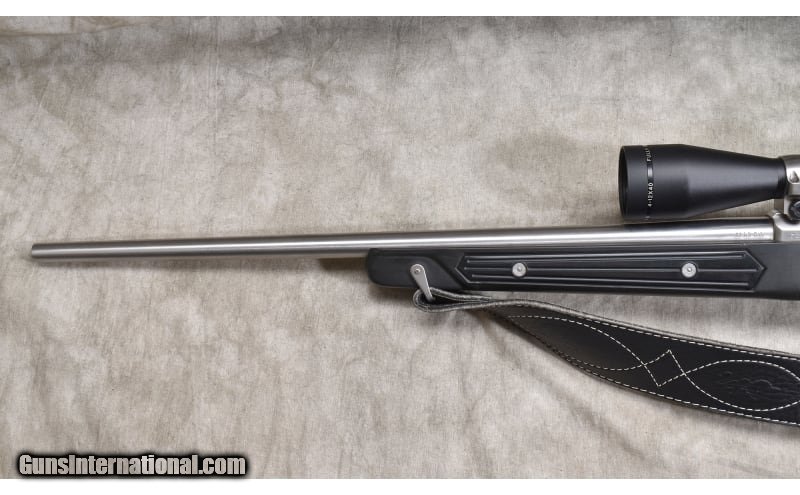 Description: This All-Weather 77/22 features low maintenance black synthetic stock and brushed stainless steel metal work. It was manufactured in 1993 and has very little for defects other than some firing residue on the muzzle. .22 Long Rifle SOLD Chambers: 10-round magazine Metal Condition: Excellent. Wood Condition: Excellent. Bore Condition: Shiny and bright with good rifling. Barrels: 20-inch Triggers: Factory trigger. Stock Dimensions: 13-5/8 inch LOP. Butt Pad: Rubber pad. Weight: 7 LB Sights: "Set up for scope, outfitted with a Simmons ProHunter 4-12x40mm scope. Item Location: Rogers |