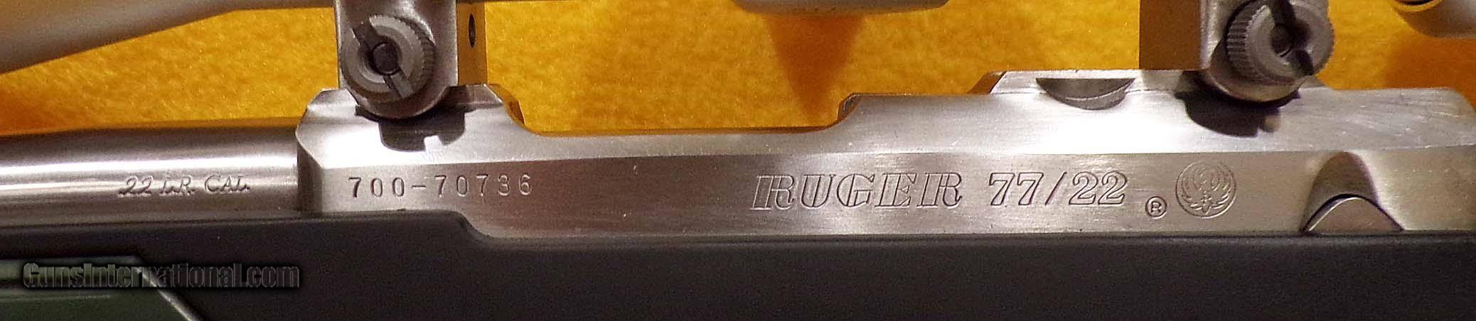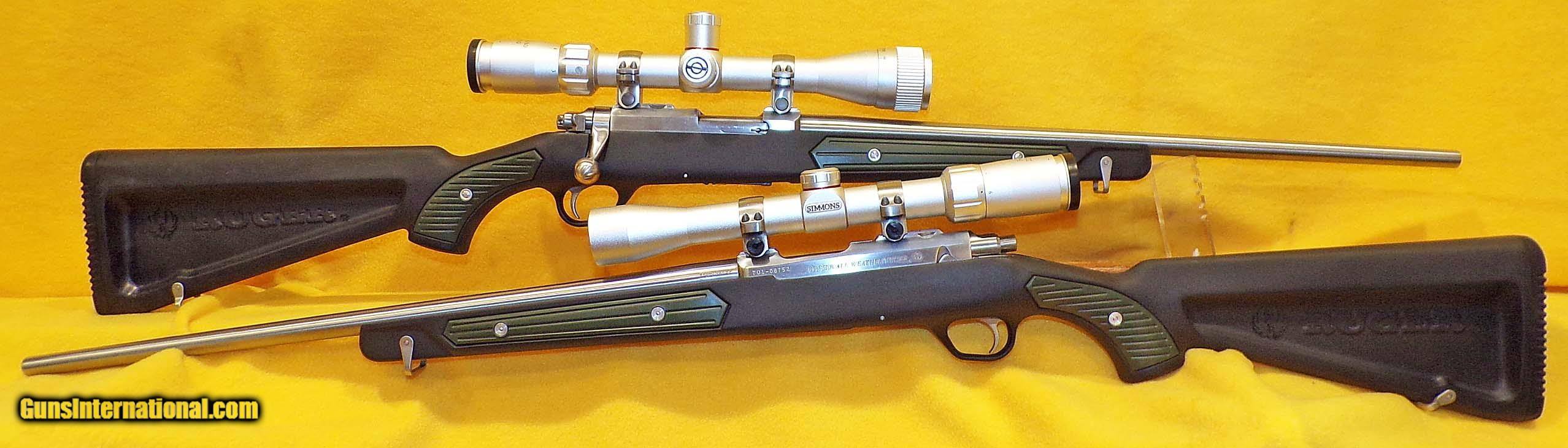 Description: RUGER ALL WEATHER 77/22 (PAIR) IN .22 L.R./.22 MAGNUM WITH 20" BARREL. COLOR STAINLESS STEEL. CONDITION 98% LIKE NEW. SERIAL NUMBER 701-08752/700-70736. PAIR OF RUGER BOLT ACTION ALL WEATHER MODEL 77/22 IN .22 LONG RIFLE AND .22 MAGNUM CALIBERS, BOTH HAVE 20 INCH STAINLESS STEEL BARRELS AND RECEIVERS WITH ALL WEATHER DUPONT ZYTEL SYNTHETIC STOCKS WITH STAINLESS STEEL RUGER RINGS, THE .22 MAG. HAS A SIMMONS 3X9 SCOPE WITH THE .22 L.R. HAVING A SIMMONS 3X9 TARGET SCOPE WITH ADJUSTABLE OBJECTIVE, BOTH ARE IN 98% LIKE NEW CONDITION. OUR STOCK # D1783/D1784 SOLD |