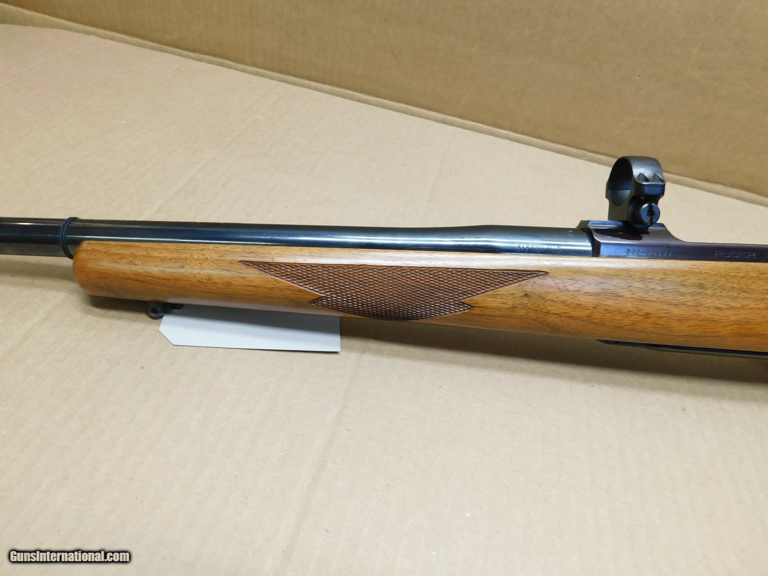 Description: This is a used in very good condition Ruger M-77 bolt action 338WM rifle It is a 3+1 shot with a 24" blued barrel Very rare rifle, has red pad, tang safety and rings SN-772-02197 SOLD Manufacturer: Ruger Model: M-77 Serial Number: 772-02197 Barrel Length: 24 Condition: Very good Metal Condition: Very Good Wood Condition: Very good Bore Condition: Very good Barrels: Blue Barrel Type: Round Action: Bolt Stock: Checkered Walnut with sling studs Butt Pad: Red Rubber Finish: Blue Extras: Red Tang Safety, Rings |