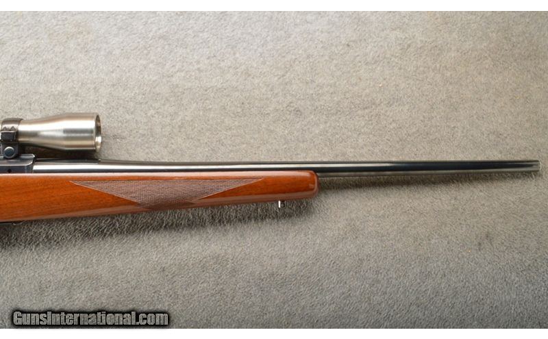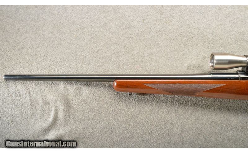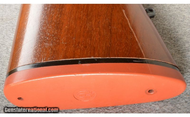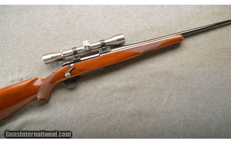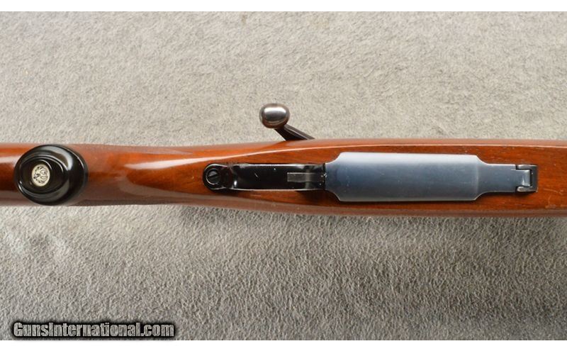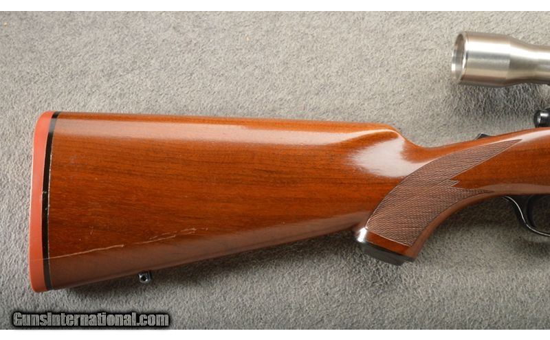 Description: This is a very nice and hard to find Ruger M77 made in 1970. This is a flat bolt model with gloss blue metal and nice mid-grade walnut. The finish on the wood is very strong but there are quite a few small field marks. This is a very hard to find .243 Win with a flat bolt, tang safety and red pad. .243 Winchester SOLD Chambers: Bolt action repeater 4+1. Metal Condition: Shows minor thinning blue at the muzzle and a little thinning on the bolt's sharp edges and the floor plate is an odd color. Wood Condition: "There are quite a few small dings, dents and thin scratches in the walnut. Bore Condition: Bright and shiny. Barrels: 22" blue. Triggers: Single blue trigger. Stock Dimensions: 13 5/8" LOP. Fore End: Nice straight grain walnut with checkering and a sling stud. Butt Pad: "Matching walnut with a checkered pistol grip, grip cap, sling stud and a red rubber butt pad. Weight: 8 Lbs. 8 Oz as pictured Sights: Weaver K4-S Stainless scope with Ruger rings. Item Location: Owatonna, MN |