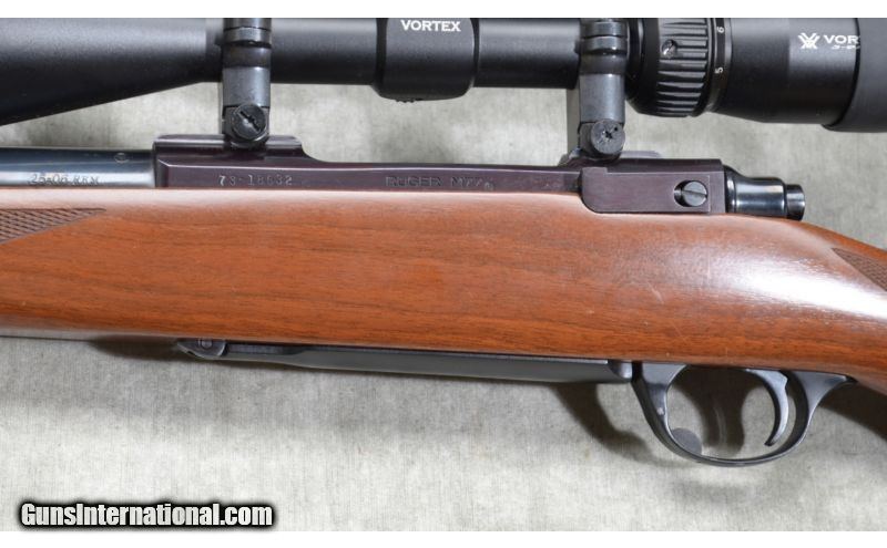 Description: This Ruger M77 features include walnut stock with pistol grip, sharp checkering and medium heavy contour barrel. It has internal magazine with hinged floor plate. It is set up for scope and furnished with a Vortex Crossfire 3-9x50mm scope. SOLD Manufacturer: 1978 based on the S/N 73-18xxx Caliber Info: .25-06 Rem. Chambers: 3 round internal magazine with hinged floor plate. Metal Condition: Excellent. It has been fired but lightly used. Wood Condition: Excellent with minimal signs of use. Bore Condition: Shiny and bright. Barrels: 24 inch blue barrel with medium heavy contour. It measures .75 at the muzzle. Triggers: Factory trigger. Stock: Checkered pistol grip walnut. Stock Dimensions: 13 - 5/8 Inch LOP. Butt Pad: Rubber pad. Weight: 10 lb. - 2 oz. as shown with scope. Sights: Set up for scope and furnished with a Vortex Crossfire 3-9x50mm scope. Extras: Scope. Item Location: Rogers,, MN |