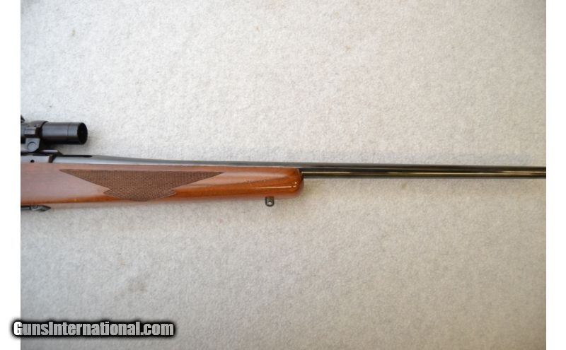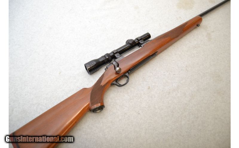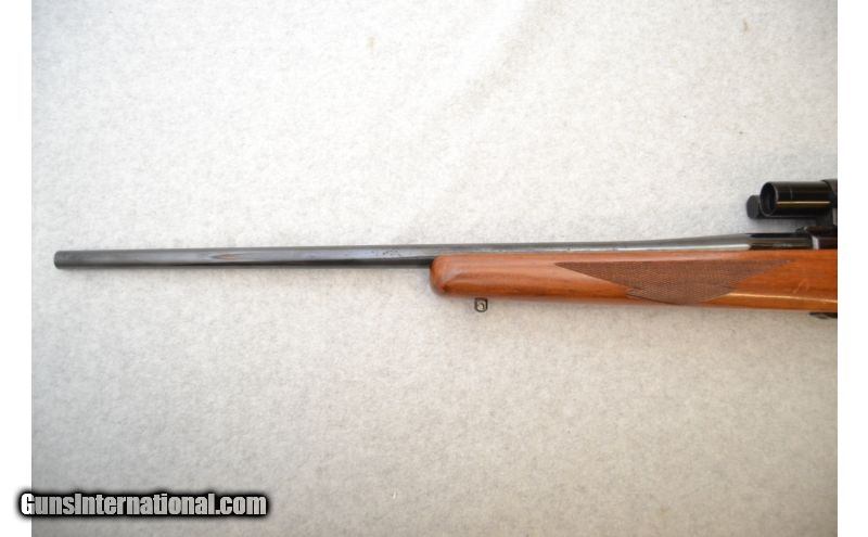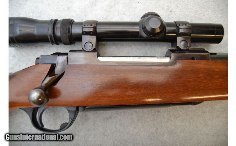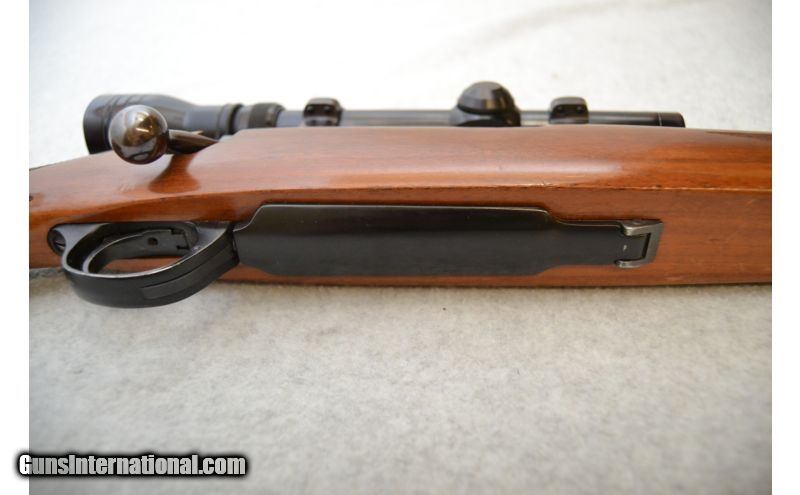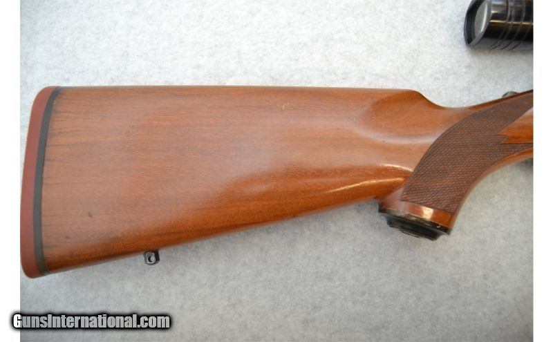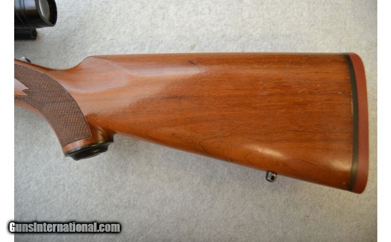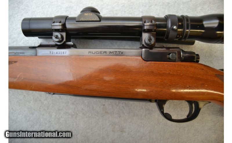 Description: This M77 is in fairly good condition overall. The finish on the barrel has some marks (see pictures) and some minor surface spotting. The hard edges also show some thinning of the bluing. The stock has certainly been through its share of hunting seasons with some areas of thinned finished, some dents, and some scratches. Bore is excellent with healthy shine and strong rifling. SOLD Manufacturer: Sources indicate 1977. Caliber Info: .270 Winchester Chambers: Bolt-action fed from an internal magazine with a hinged floor plate. Metal Condition: Good. Wood Condition: Good. Bore Condition: Excellent. Barrels: 22" With gloss bluing. Triggers: Narrow blued metal with smooth surface. Stock: Hardwood with diamond pattern checkered grip areas and black metal grip cap with the Ruger logo. Stock Dimensions: 13 3/4" LOP Fore End: Hardwood with "downward diamond" pattern checkered side panels. Butt Pad: Red rubber pad with the Ruger logo on it. Weight: 8lbs Sights: No iron sights. Is equipped with a Redfield 1 3/4-5x scope. Item Location: Green Bay, WI |