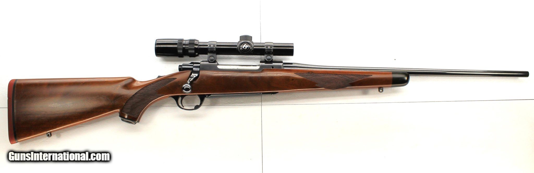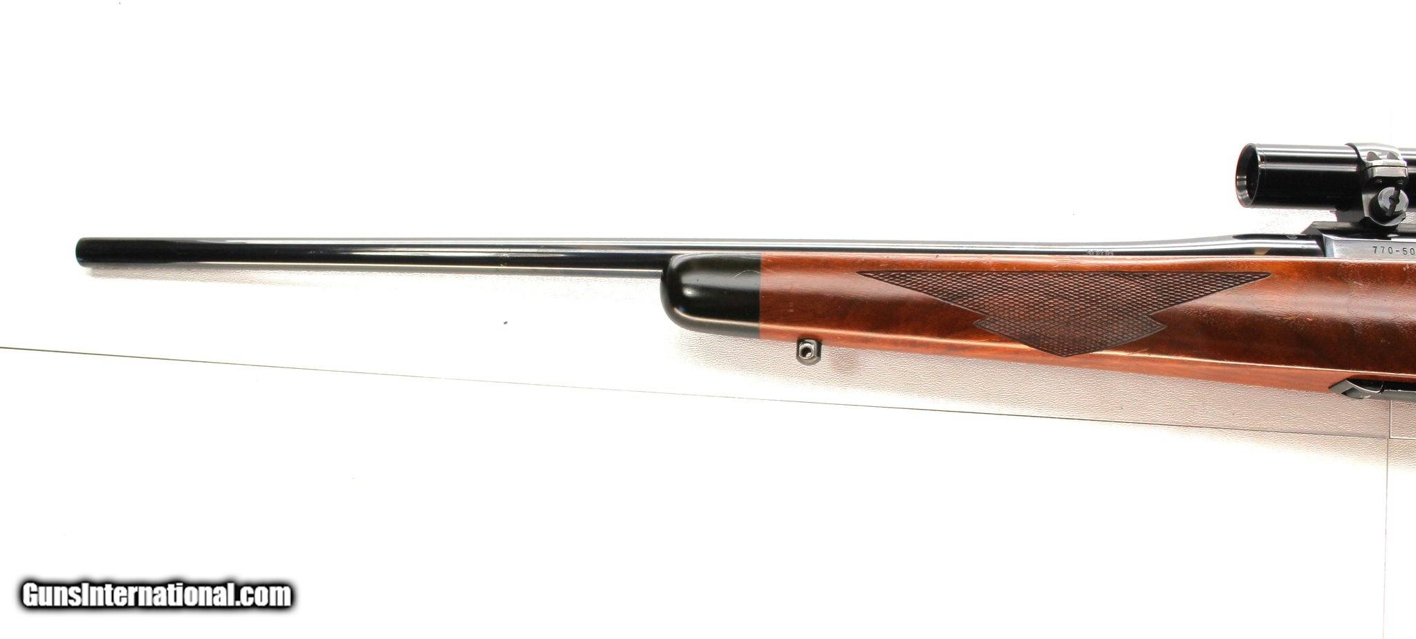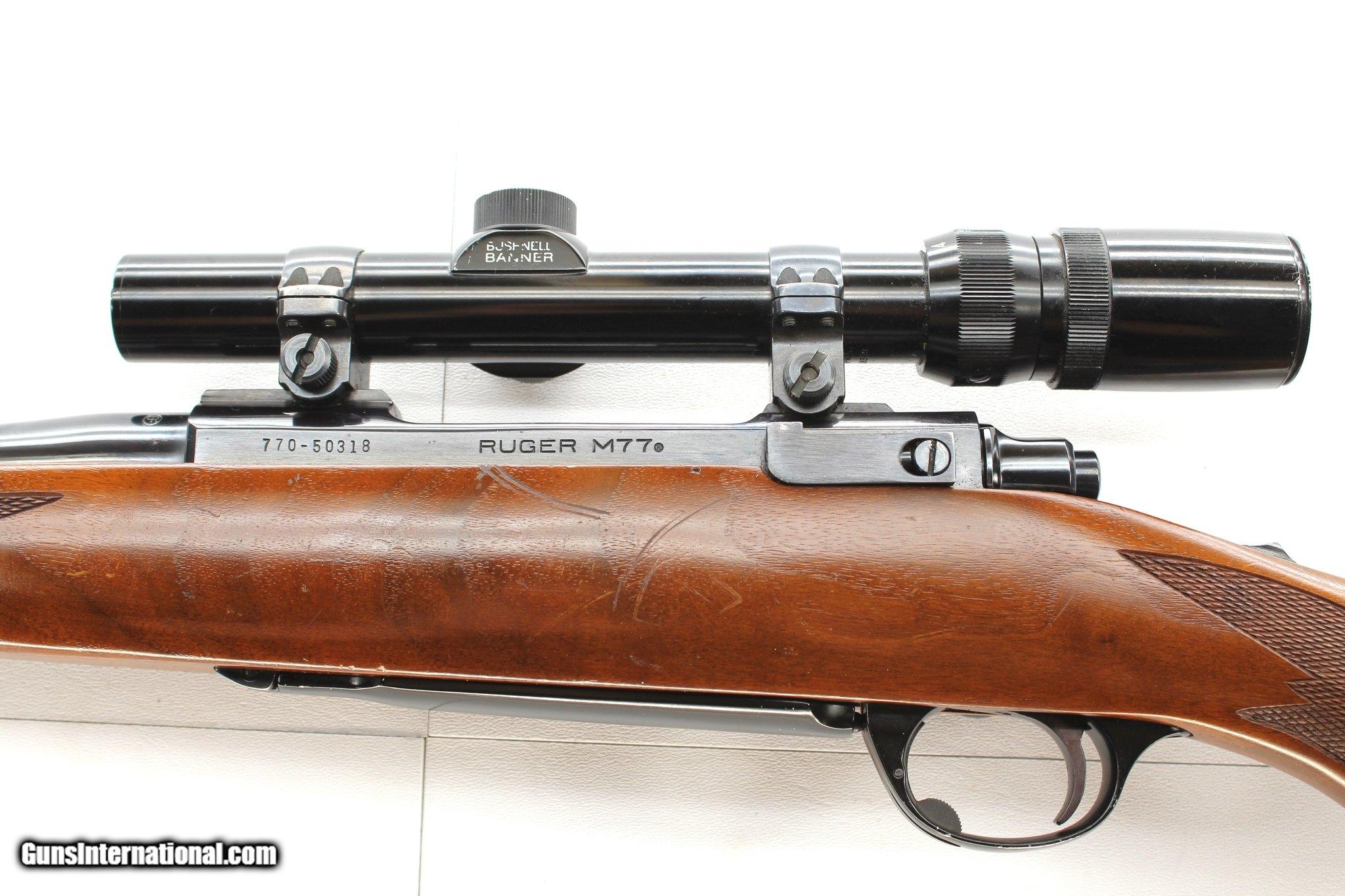 Description: Guns Listing ID: 1344150 SER #770-50318, .30-06 , 22” barrel with a bright excellent bore. The barrel and bottom metal retain 96% original blue with a couple tiny spots of wear and minute storage scratches. The action has toned to a rich Ruger plum, the bolt body remains bright some spots and is numbered to the rifle. The checkered American walnut capped pistolgrip stock remains in good-fair condition with handling marks and wear along the edges on both sides of the floorplate some scratches as with a hunted rifle. Equipped with a tang safety, a Bushnell banner optic are included power and field view not known markings are under the scope rings . The action appears to function well mechanically. A nice tang safety M77 rifle built in 1987. SOLD Manufacturer: RUGER Model: M77 Caliber Info: .30-03 SPRINGFIELD Condition: Used - Non-Certified Barrels: 22 BARREL Finish: BLUE AND BLACK |