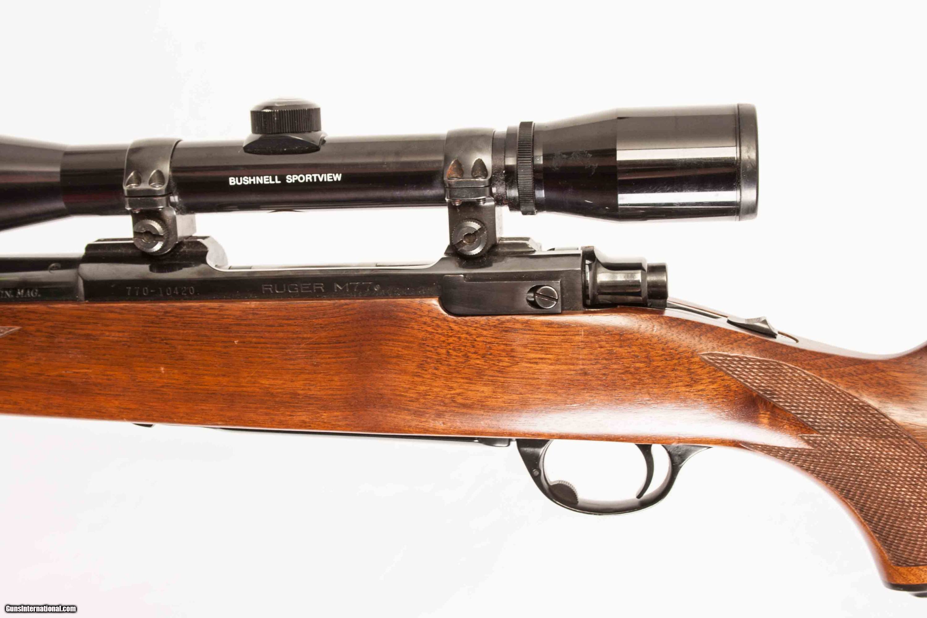 RUGER M77 CHAMBERED IN 300 WINMAG WITH A 24 INCH BARREL BRIGHT BORE GOOD GROOVES AND A BUSHNELL 3-9X40 SCOPE. THIS GUN IS IN GOOD CONDITION AND IS COVERED BY DURY'S LIFETIME WARRANTY.