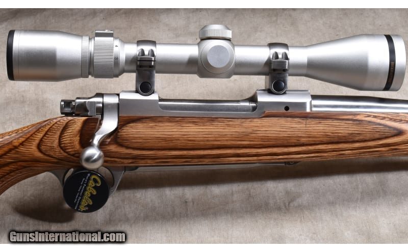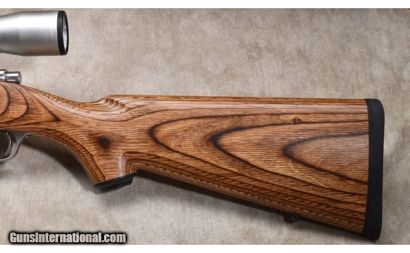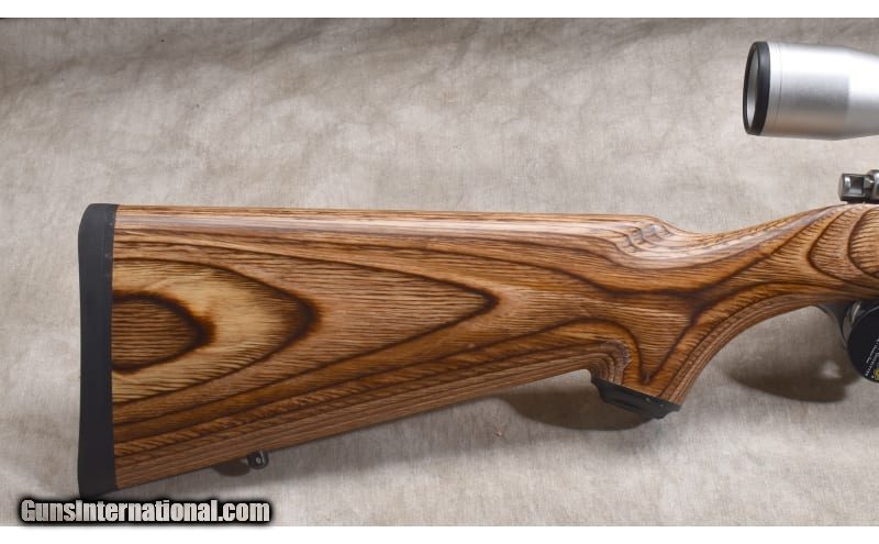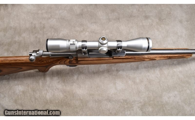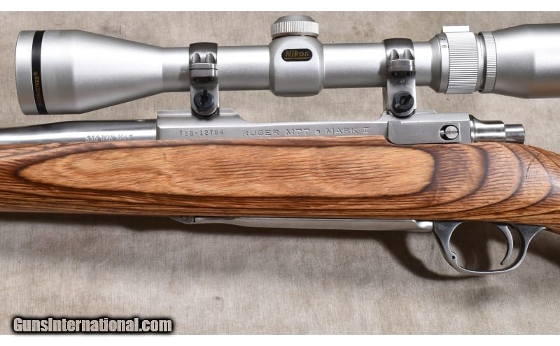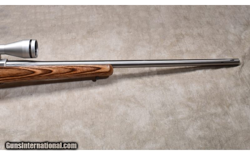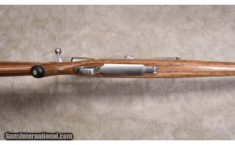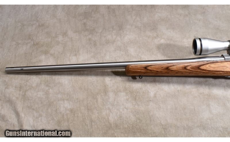 Description: Manufactured in 2001, this M77 features satin stainless steel and laminated hardwood construction. It has internal magazine with hinged floor plate. it will be an excellent choice for rough country dangerous game. .338 Winchester Magnum SOLD Chambers: 3 rounds Metal Condition: Excellent. Wood Condition: Excellent. Bore Condition: Shiny and bright with good rifling. Barrels: 24 inches Triggers: Factory trigger. Stock Dimensions: LOP: 13-1/2 inches Butt Pad: Rubber pad. Weight: 9 lb - 6 oz incl scope Sights: "Set up for scope, outfitted with a NIKON BUCKMASTERS 3-9X scope Item Location: Rogers |