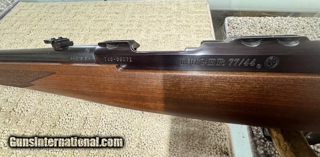 Description: Ruger M77/44 .44 Magnum 18" barrel. like new without box. We don't think this rifle has been fired besides the test firing. Has small handling mark on left side of the stock. Actual shipping cost will be added to total. SOLD Rifle Caliber: .44 Magnum Manufacturer: Ruger Model: m77/44 Serial Number: 740-00171 Barrel Length: 18 Condition: very good Metal Condition: very good Wood Condition: very good Bore Condition: like new Barrel Type: Rifled Action: Bolt |