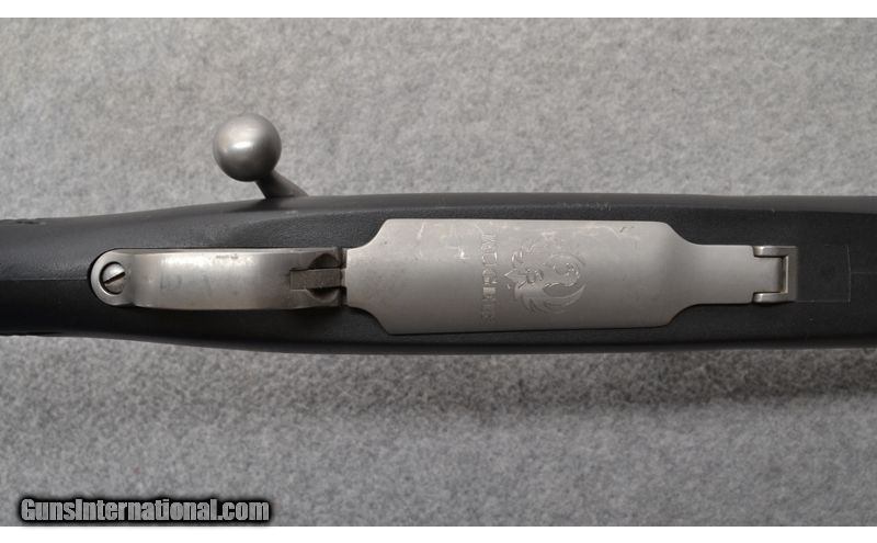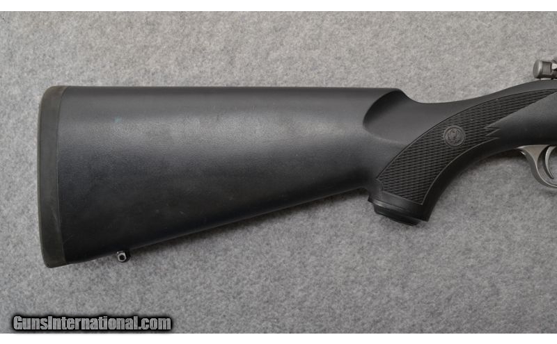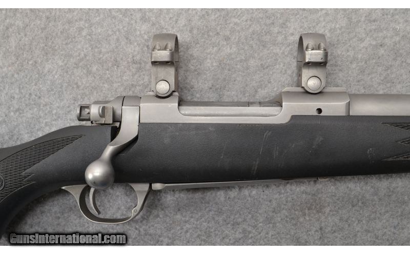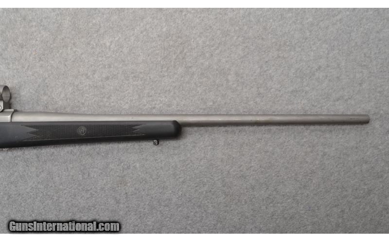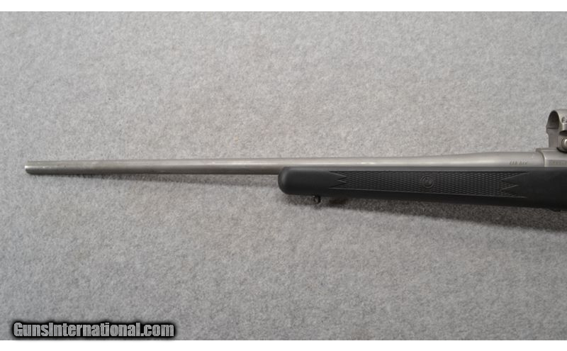 Description: Ruger Model 77 Hawkeye .223 Remington with 22" stainless steel barrel. Includes factory one inch rings. The bore is bright with strong rifling. Action, barrel, and floor plate have numerous rub marks and scratches though none are through the finish. Factory black synthetic stock shows some scratches and handling marks. .223 Remington SOLD Metal Condition: Action, barrel, and floor plate have numerous rub marks and scratches though none are through the finish. Wood Condition: Factory black synthetic stock shows some scratches and handling marks. Bore Condition: Bright bore with strong rifling. Barrels: 22" stainless steel barrel. Triggers: Smooth trigger. Stock Dimensions: 13 3/4" LOP Fore End: Factory black synthetic stock and fore end. Butt Pad: Factory black rubber recoil pad. Weight: 7 lb 15 Oz Sights: Includes factory one inch rings. Item Location: Mitchell, SD |