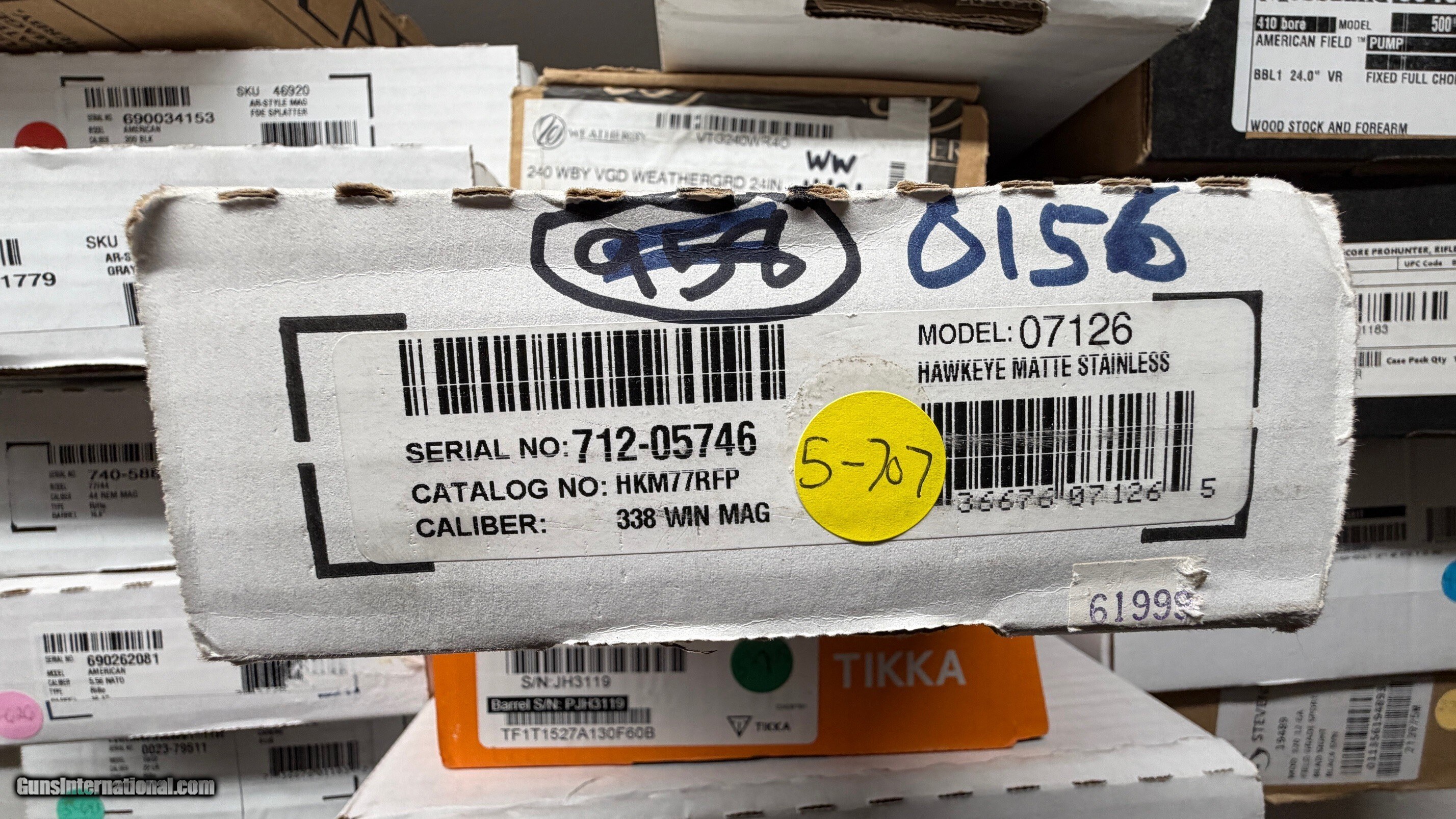 Description: Ruger M77 Hawkeye – .338 Winchester Magnum – Matte Stainless – New Old Stock Price: $950.00 Location: Coyland Creek, Wisconsin Description Offered for sale is a Ruger M77 Hawkeye chambered in .338 Winchester Magnum, featuring a matte stainless steel barreled action and factory synthetic stock. This rifle is New Old Stock — unfired, originally sold as new, and remaining in excellent condition. It has been handled only for storage and display. The Hawkeye series is well known for its controlled-round-feed action, rugged construction, and reliability in harsh hunting conditions. Chambered in .338 Win Mag, this rifle is an outstanding choice for elk, moose, bear, and other large game, particularly for hunters who value penetration and terminal performance. Specifications