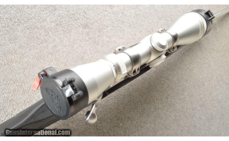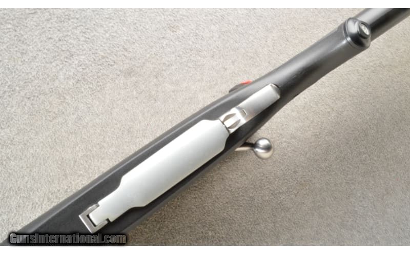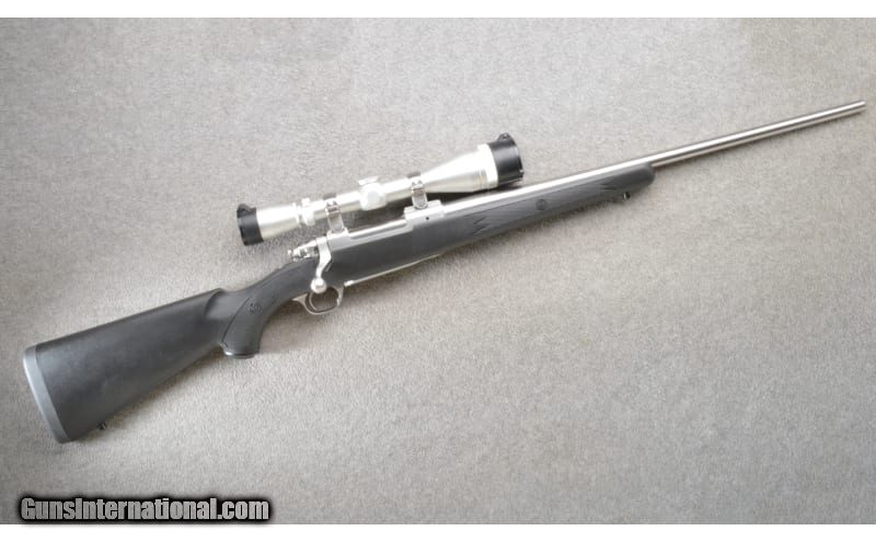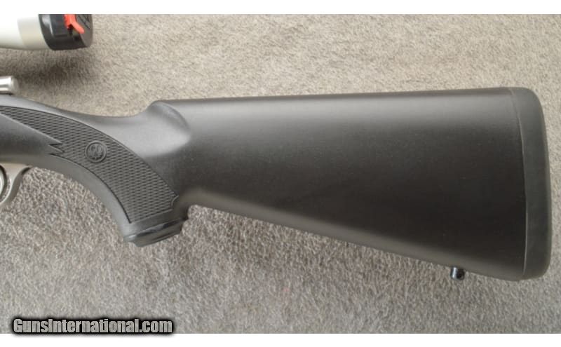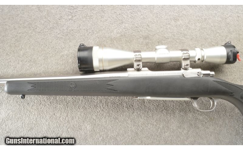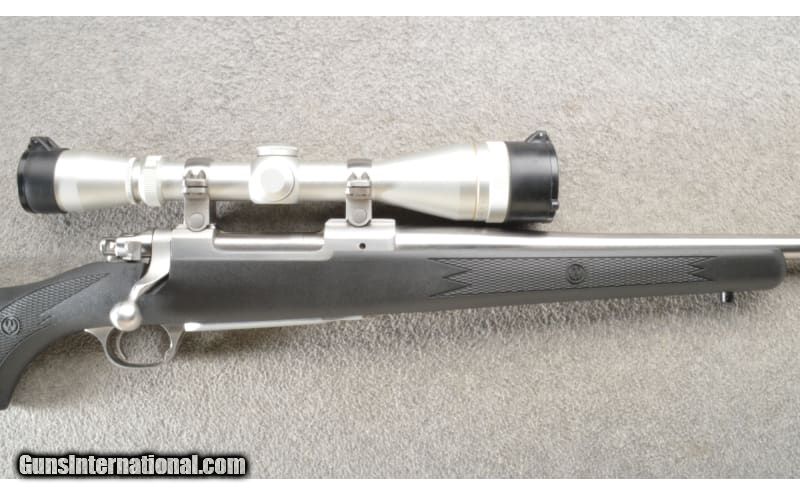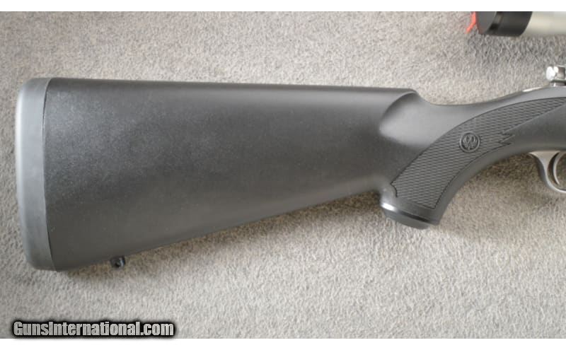 Description: Very nice condition Ruger M77 Mark II bolt action rifle chambered in 22-250 Remington with a 22" barrel. This gun has a stainless finish, black composition stock, internal box magazine, Leupold 4-12 VX-II scope with flip up covers, hinged floor plate, sling mounts, soft rubber recoil pad, serial #792-18026. Comes with the factory matched box and paper work. .22-250 Remington SOLD Chambers: Bolt action. Metal Condition: Excellent. Bore Condition: Bright strong bore. Barrels: 22" barrel. Triggers: Single. Fore End: Synthetic. Butt Pad: Rubber. Weight: 8.5 lbs Sights: Scope. Item Location: Owatonna, MN |