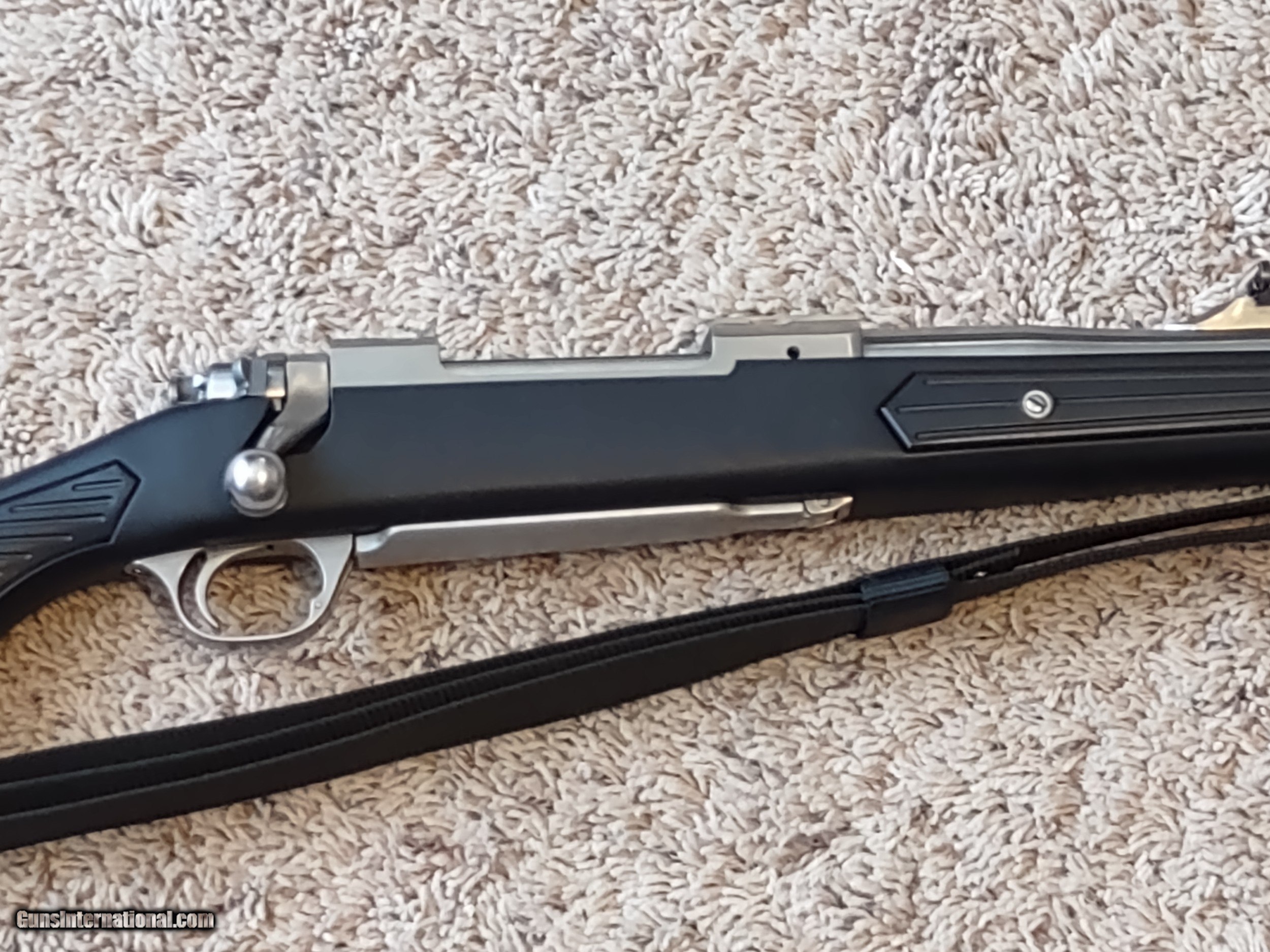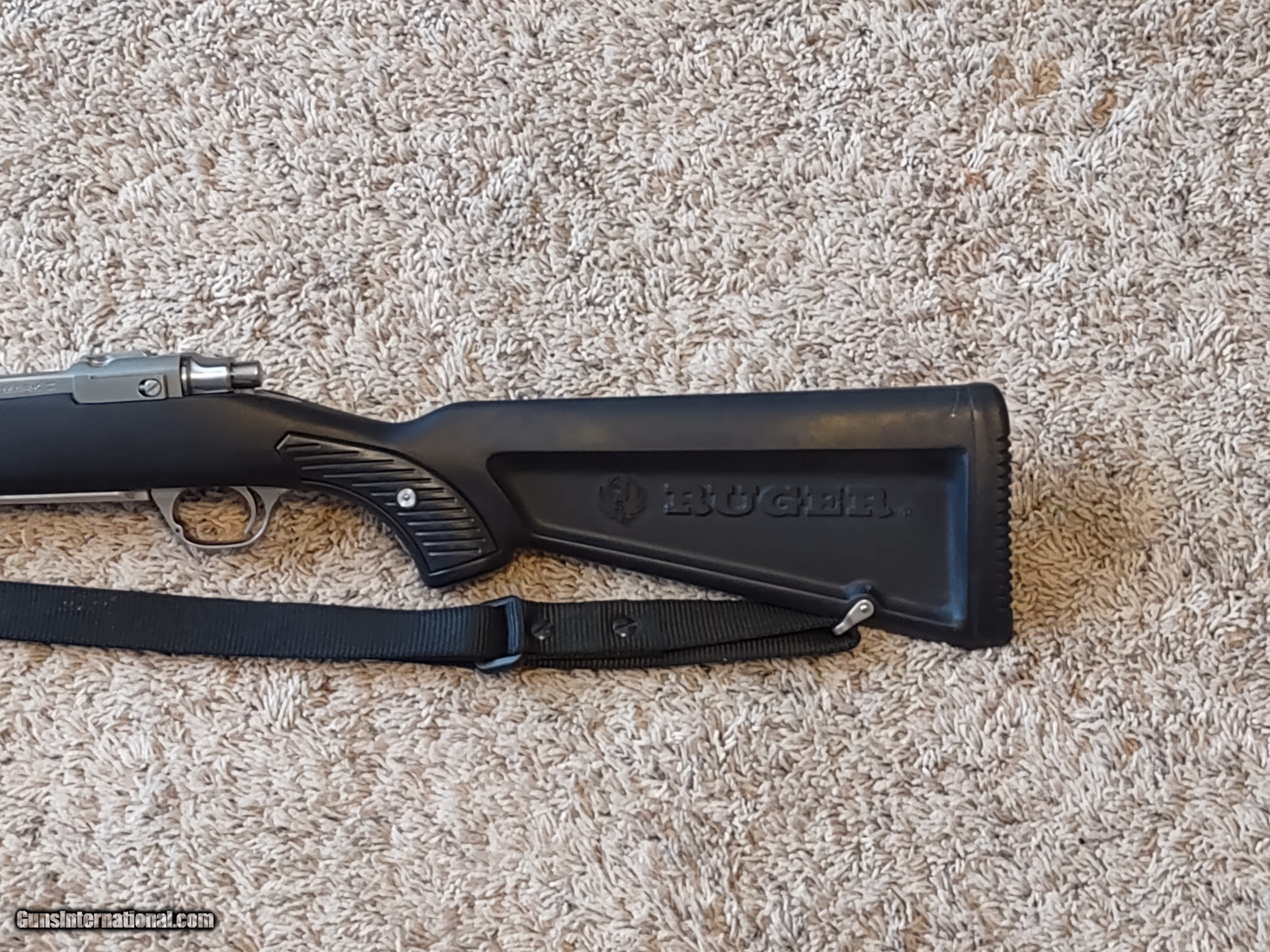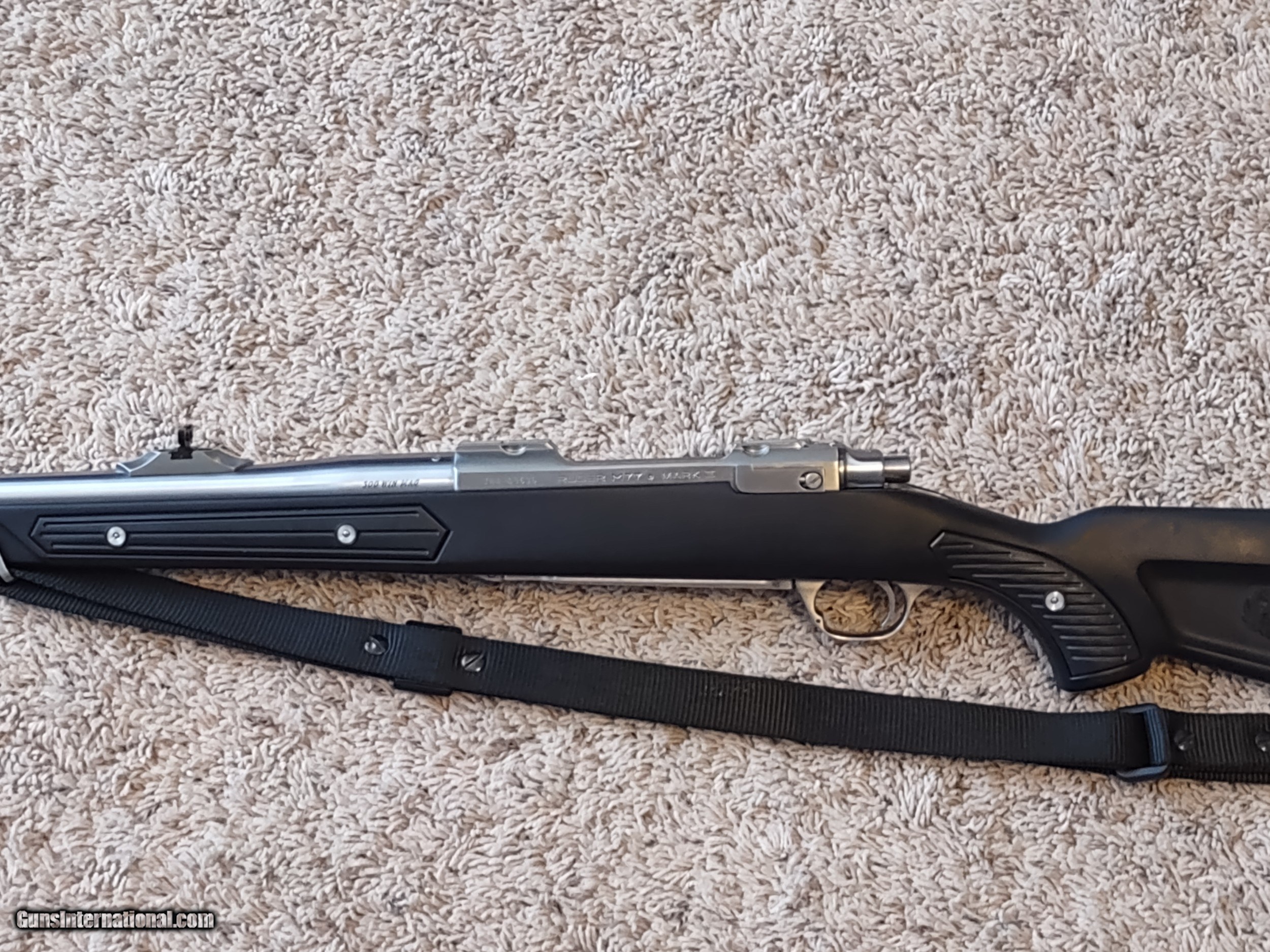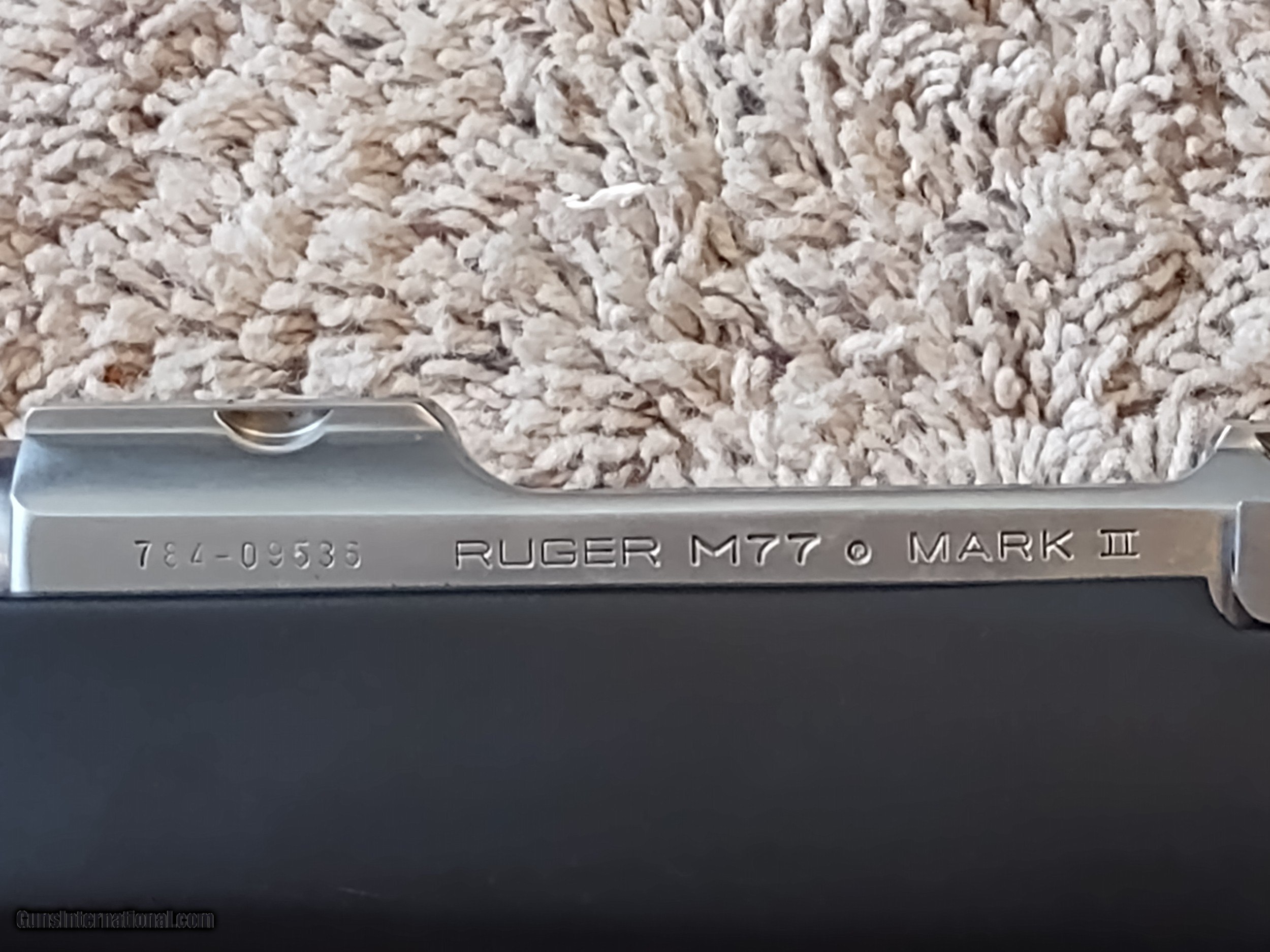 Description: Ruger M77 Mark ll stainless steel zytel skeleton paddle stock 300 win mag bolt action rifle excellent condition , stock excellent condition, metal excellent condition only minor mar on back of hinge plate can be seen in pictures, early production with factory iron sights, serial number 784-09536, $45 shipping SOLD Rifle Caliber: .300 Winchester Magnum Manufacturer: Ruger Model: M77 Mark ll Serial Number: 784-09536 Barrel Length: 24 Condition: Excellent Metal Condition: Excellent |