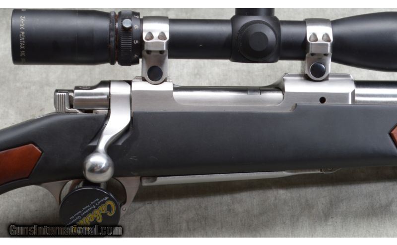 Description: Features on this rifle include black Zytel stock with pistol grip, satin stainless steel metal parts, Pentax 3x-9x scope, and internal magazine with hinged floorplate. SOLD Manufacturer: 1991 based upon the S/N 780-51xxx Caliber Info: 7.62 x 39 MM Chambers: Internal magazine with hinged floorplate. Metal Condition: Excellent - could pass for new. Certainly wasn't fired much if at all. Wood Condition: Excellent - could pass for new. Bore Condition: Shiny and bright. Barrels: 22 inch satin stainless steel without sights. Triggers: Factory trigger. Stock: Pistol grip black Dupont Zytel with hardwood grip panels in the pistol grip and the forearm. Stock Dimensions: 13 - 1/2 inch LOP. Butt Pad: Grooved black plate. Weight: 7 lb. - 13 oz. as shown with scope. Sights: Setup for your choice of scope and includes rings. Outfitted with a Pentax 3x-9x scope. Extras: Scope, rings. Item Location: Rogers,, MN |