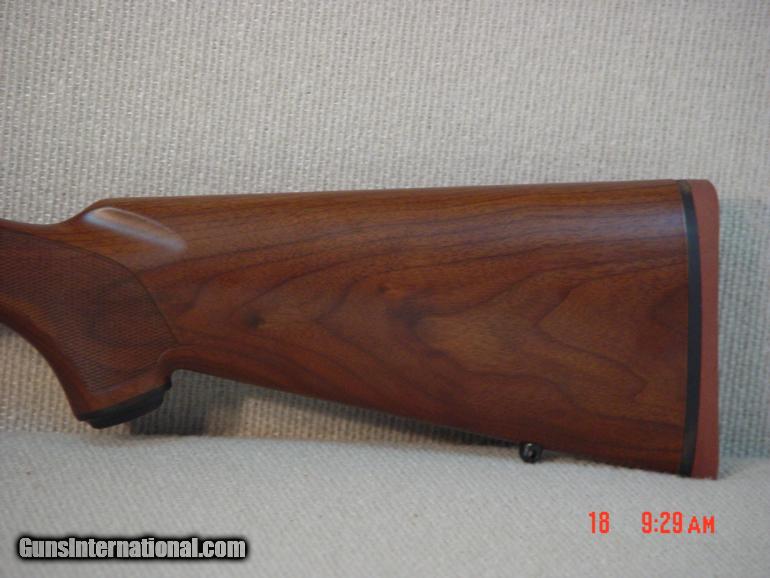 The satin blue barrel and receiver are mounted on a beautiful California walnut stock. The pistol grip features a cap with a Ruger eagle and the floor plate is covered with the Ruger logo. Deeply cut checkering covers the front & rear grip surfaces.