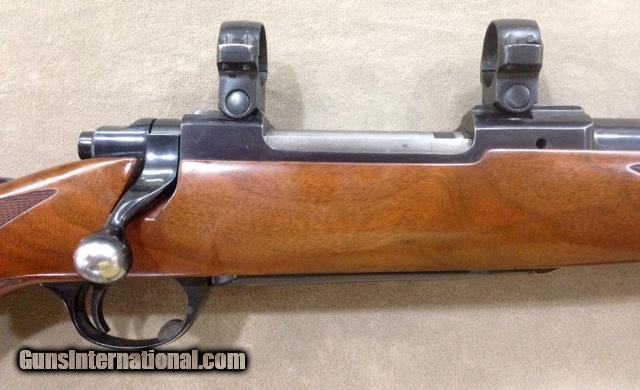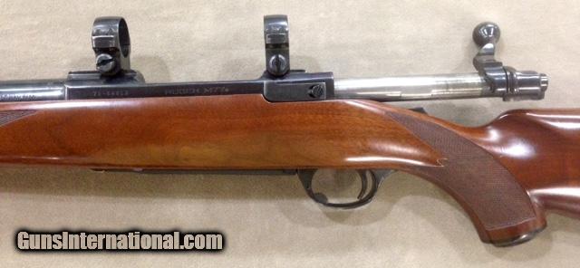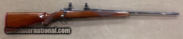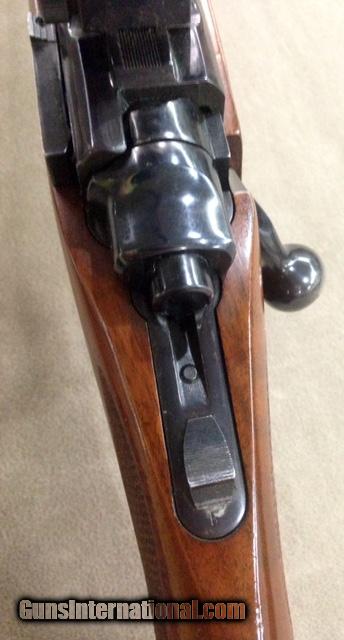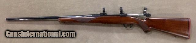 Description: This early model 77 Ruger retains the original tang safety and the red rubber recoil pad. Rifle is equipped with Ruger factory rings. Factory blue is 99+% and rifle buttstock retains all original finish with only the slightest of handling marks present on the forearm which is hardly noticeable. Another closet or gun vault queen that has seen very little if any use. Just a nice near perfect gun in a proven large caliber great for All North American or African Plains game. From personal experience this caliber makes a great western state "Long Range" Elk gun. SOLD |