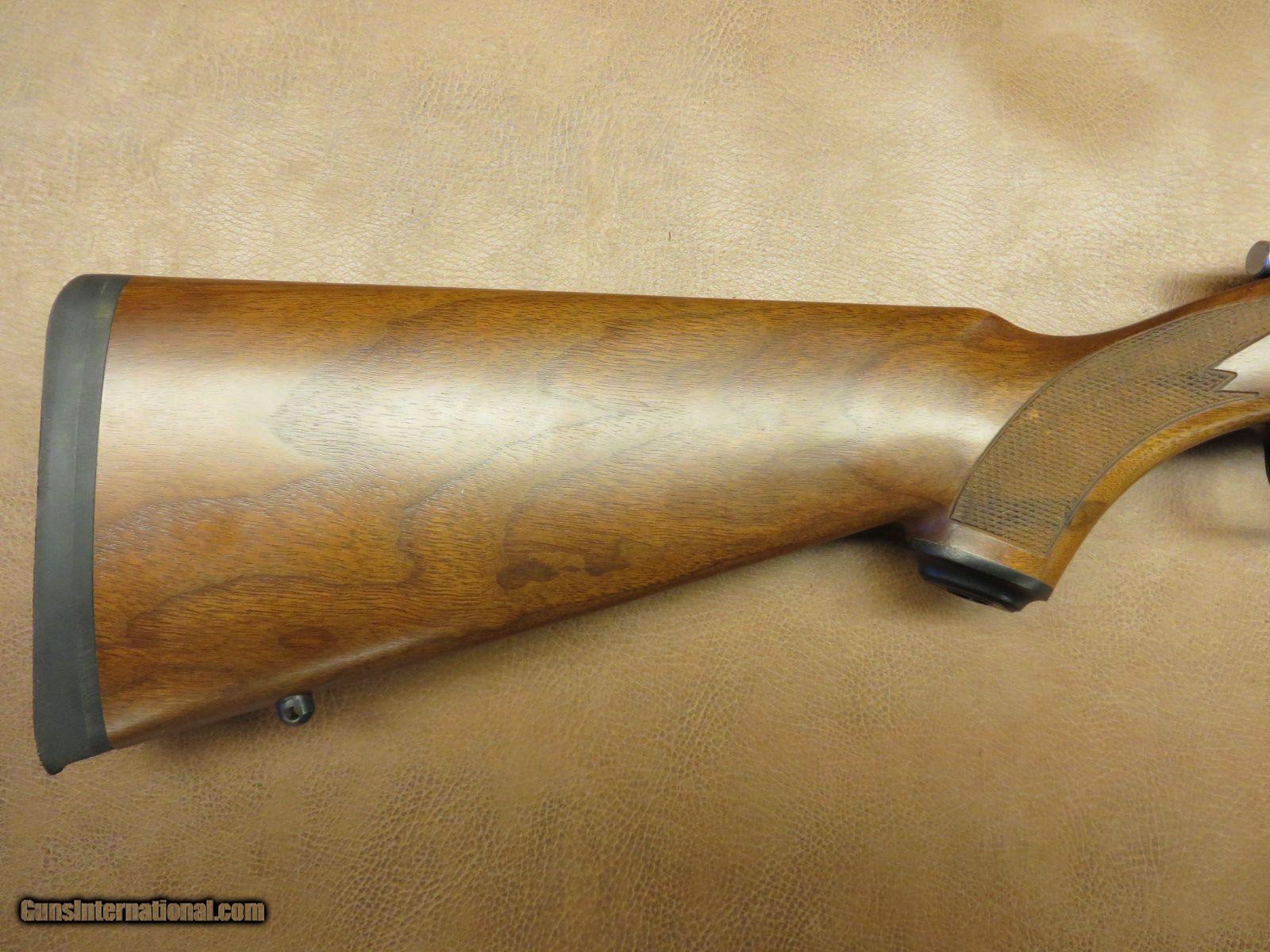 Description: .22 Hornet has 20 inch barrel with factory sights and Ruger scope mounting rings. Serial number 720-67xxx. Checkered walnut stock has sling swivel studs, pistol grip cap, and original rubber butt pad. All 99%+ condition in original box. SOLD |