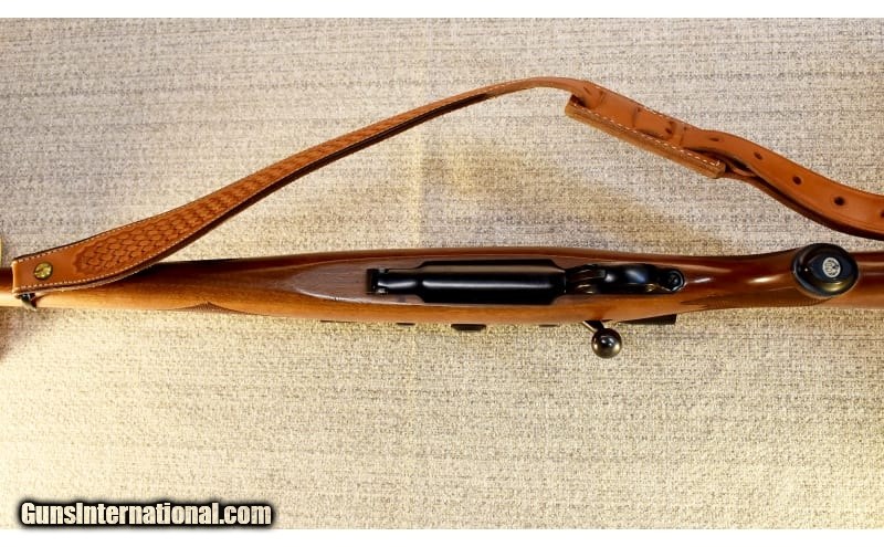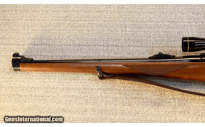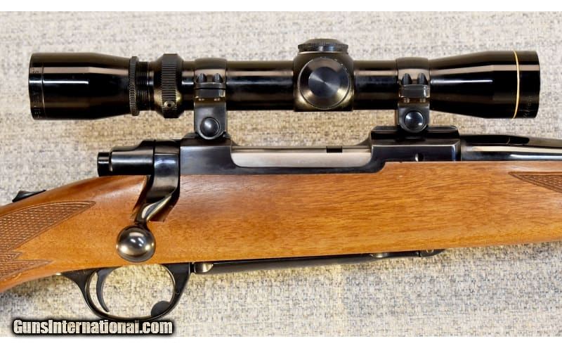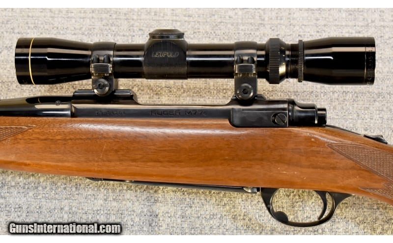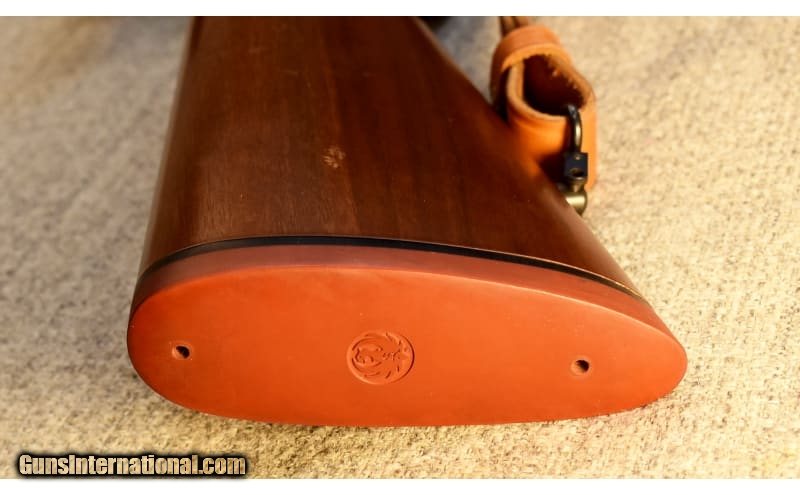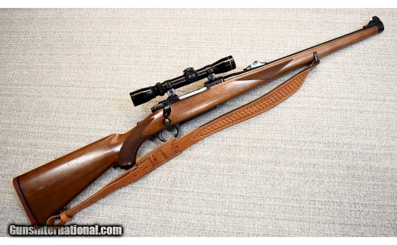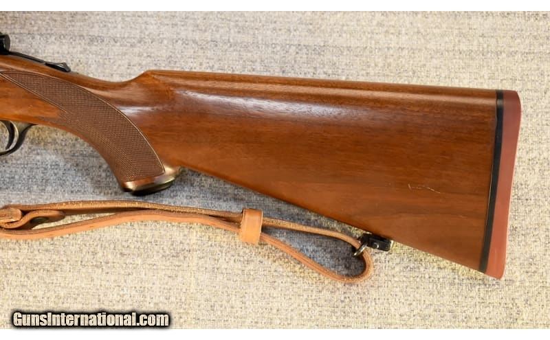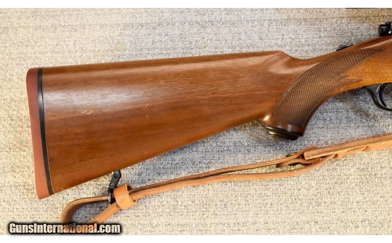 Description: This is a pre-owned Ruger model 77 International manufactured in 1973 with a tang-mounted safety and chambered in .250 Savage .250 Savage SOLD Metal Condition: Very good overall with a few small scratches and light wear on the edges of the fore end tip Wood Condition: "Quite good with a few small to medium-sized scratches, a few small dents and a cluster of dents on the right side of the stock Bore Condition: Clean with bright lands Barrels: 18.5 Stock Dimensions: 13 1/2" LOP Fore End: Full length checkered walnut Butt Pad: Red Ruger pad Weight: 7 Lbs. 10 Oz. Sights: "Blade front, folding rear with Leupold Vari-X Compact 2-7x28mm riflescope Item Location: Glendale, AZ |