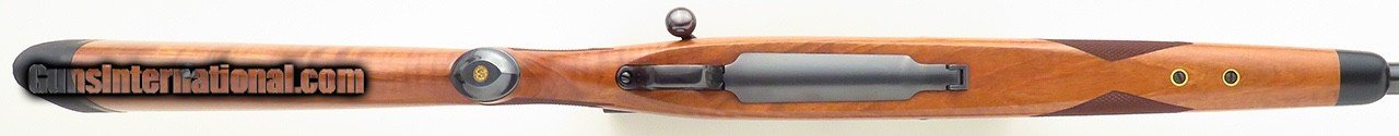 Description: Ruger Model 77 Magnum .375 H&H Magnum. Made in 2006, serial 750-05843 has a 23-inch barrel (.755-inch muzzle diameter) with a banded & scalloped front sight base topped by a brass-beaded blade, banded sling swivel stud and a quarter rib rear sight (serrated flat, one fixed express leaf with sighting line and two U-notched folders). The action has integral mount bases, a three-position safety and steel bottom metal (inside-the-bow release button). The AA-grade English walnut stock is formalized with an ebony forend tip, panel checkering, crossbolt, steel grip cap and a Pachmayr Decelerator recoil pad. Metal finish is rust blue and the wood is a complimentary satin. Magazine capacity is five rounds (four plus one) and the bolt closes over a single-fed round with ease. Feeding/extraction/ejection is positive and effortless. OPTIC: A Leupold VX-III 2.5-8x36mm scope (1-inch tube, matte finish, Duplex reticle, .25-MOA adjustment clicks) rides in Ruger mounts (front mount is extended). DIMENSIONS: Weight is 11.2 pounds and the length-of-pull is 14.0 inches. CONDITION: The bore is pristine. Metal finish is approximately 97 percent with a few tiny freckles on the right side of the chamber and floor plate along with trace thinning on the grip cap. Wood is also approximately 97 percent, with a minor void in the ebony (top right at barrel line) and a few handling impressions. Mechanics are solid. The optic is tack sharp with unmolested lens coatings. The price is firm and layaway is available. $2,500 plus shipping. SOLD Rifle Caliber: .375 H&H Magnum |