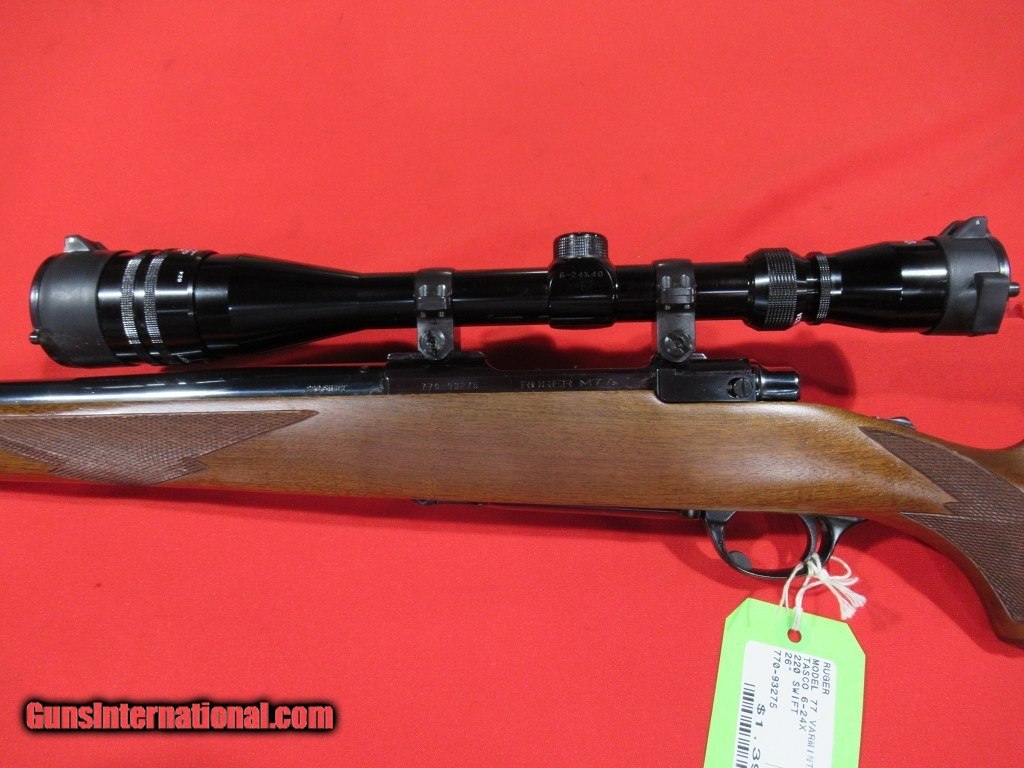 Description: Ruger Model 77 Varmint 220 Swift 26" Heavy Barrel w/ Scope -- Factory original and excellent condition. THis rifle is topped with a Tasco 6-24X scope. SOLD |