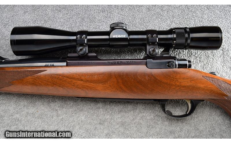 Description: This Ruger M77 was manufactured in 1989 and remains in excellent overall condition. One scratch on left receiver under bolt release, one on front right in front of checkered. Blue and bore are excellent. The .358 Win. Cal. is scarce in this model. This is a Controlled Round Feed action. Gun has original iron sights and a period Weaver Micro Trac scope with a duplex reticle mounted on Ruger rings. Very nice gun! No box. .358 Winchester SOLD Metal Condition: Excellent Wood Condition: Excellent Bore Condition: Excellent Barrels: 19 Triggers: Factory Stock Dimensions: 13 3/4" LOP Fore End: Checkered Walnut Butt Pad: Ruger Red Rubber Butt Pad Weight: 7 1/2 lbs Sights: Post & Bead Front - Folding Notch Rear - Weaver Micro Trac Scope in Ruger Rings with Duplex Reticle Item Location: Wheeling |