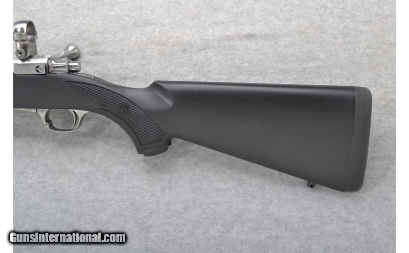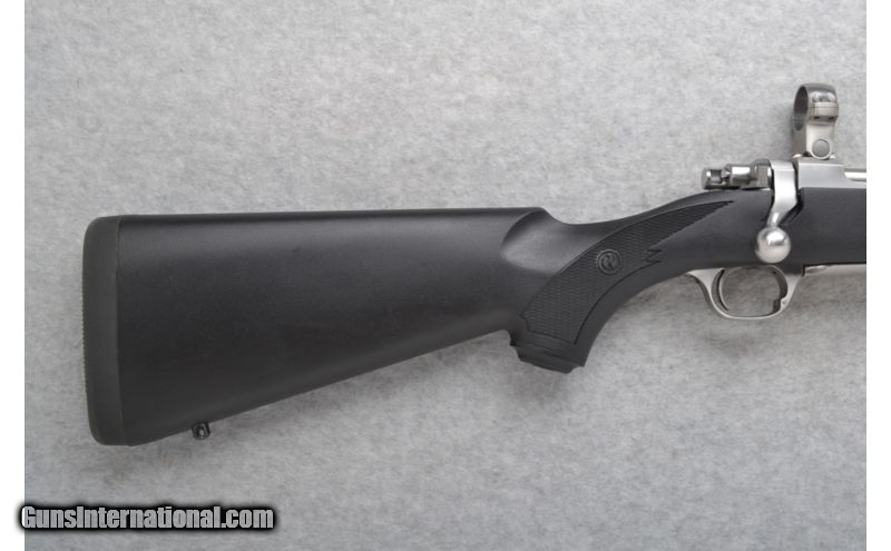 Description: SOLD Caliber Info: .350 Rem. Mag. Chambers: Hinged floorplate. Metal Condition: Excellent. Bore Condition: Excellent. Barrels: 22 inch satin stainless steel. Stock: Checkered black polymer pistol grip with a Ruger black cap. Stock Dimensions: LOP 13 3/4 inches. Fore End: Checkered grip black polymer. Butt Pad: Grooved Ruger black rubber recoil pad. Weight: 7 lbs. 6 oz. Sights: No iron sights. Scope rings attached. Item Location: Richfield, WI |