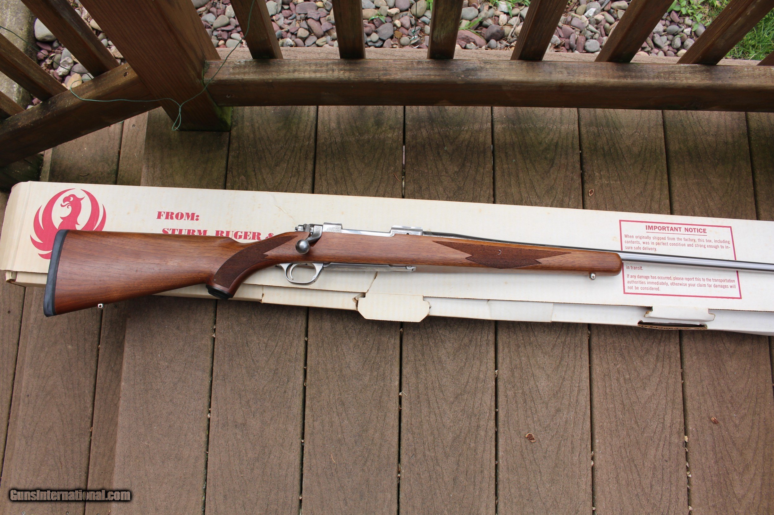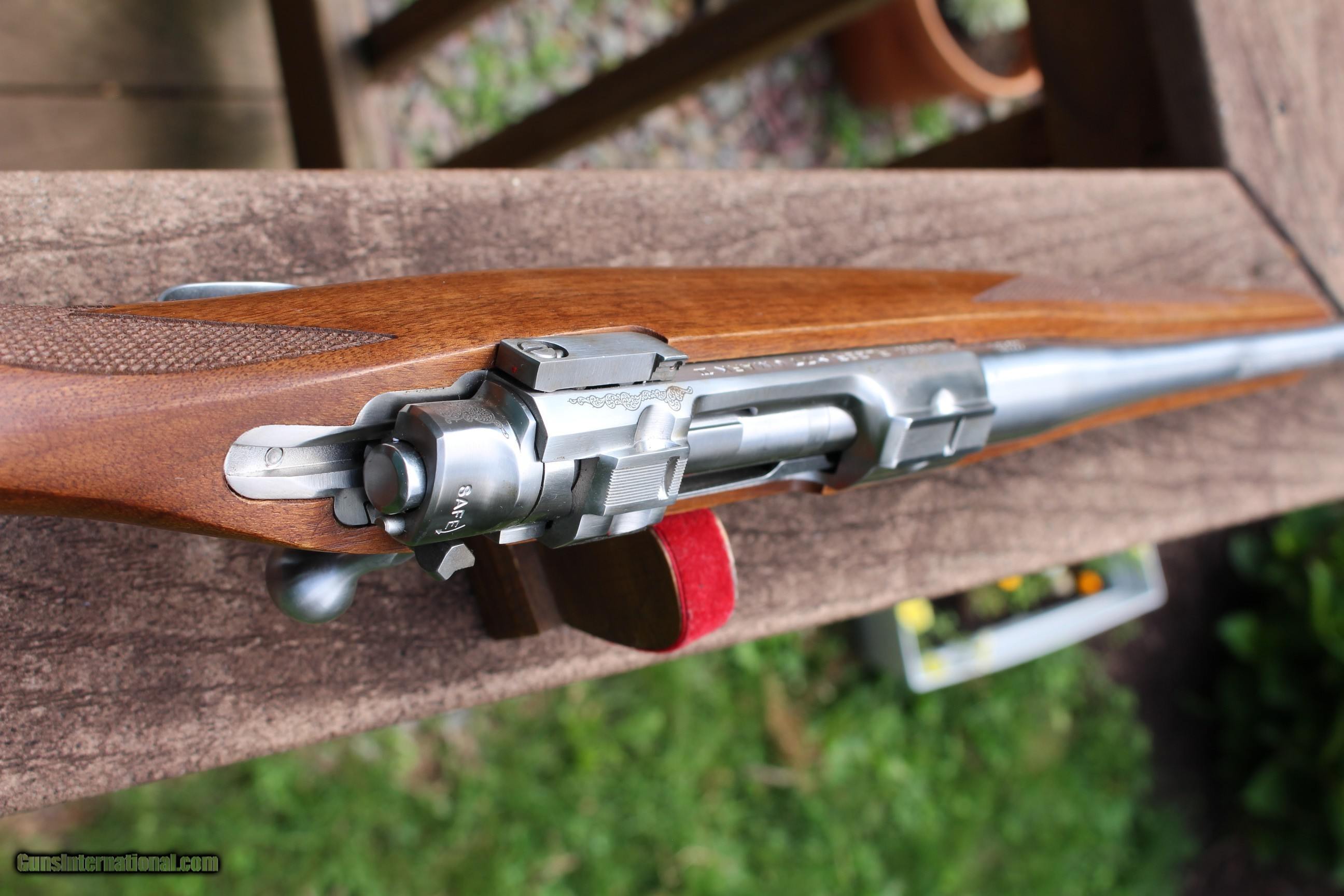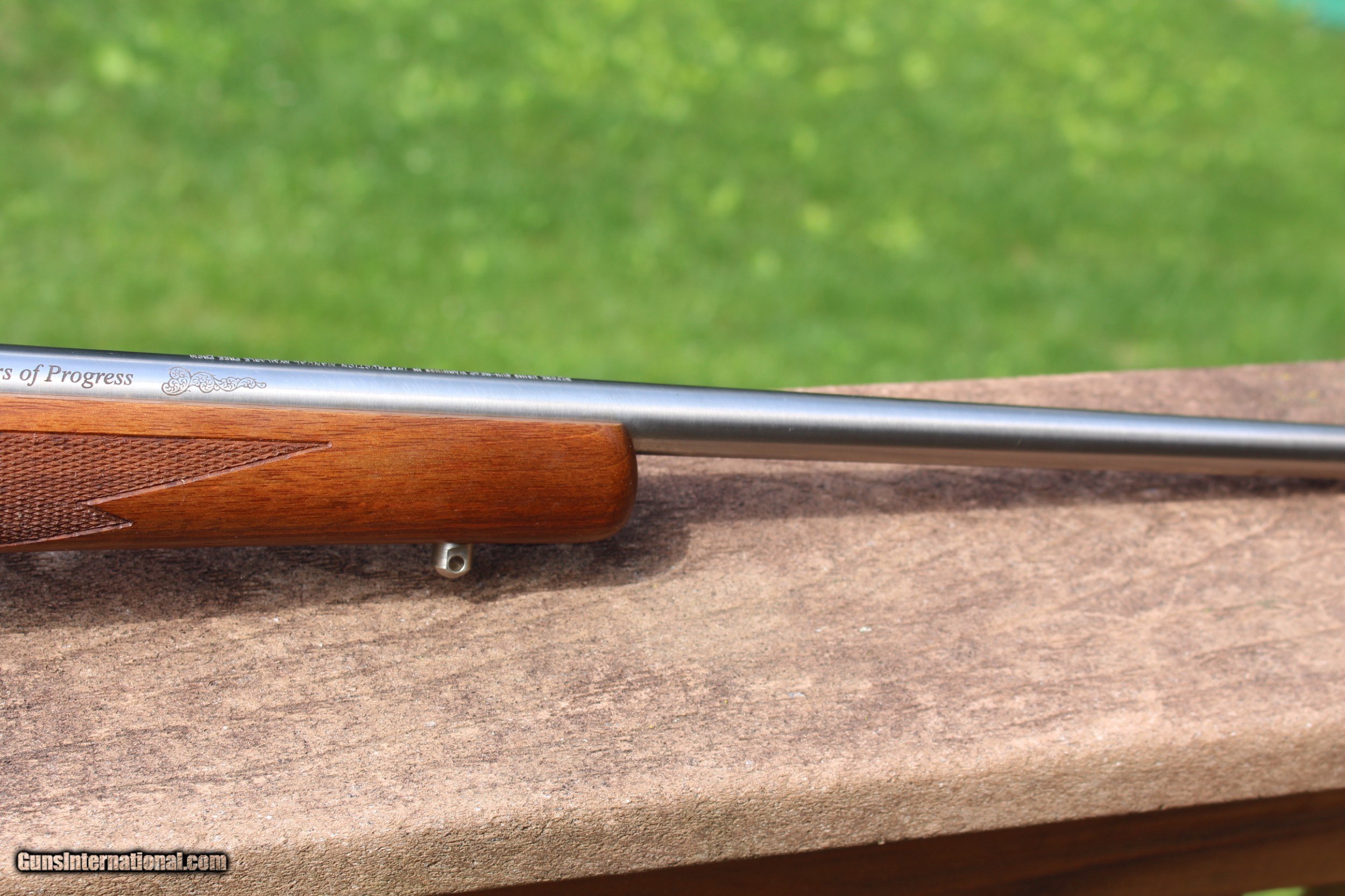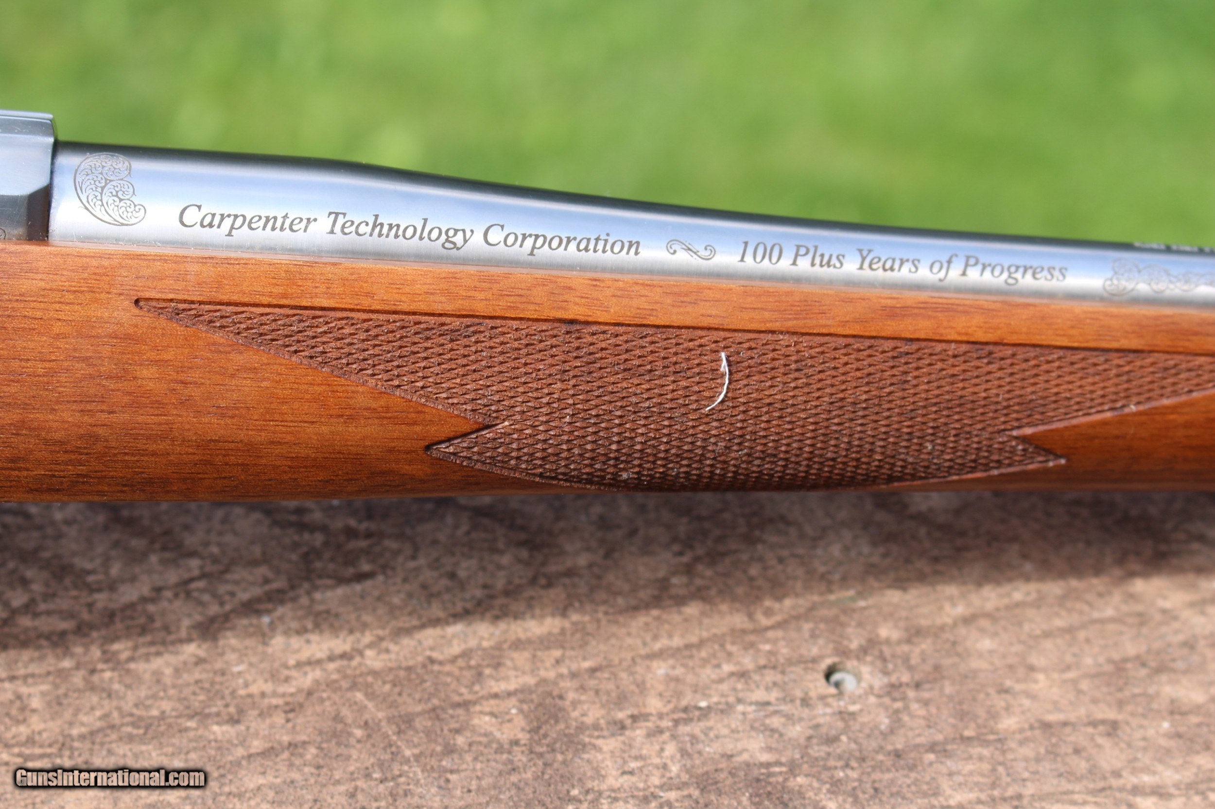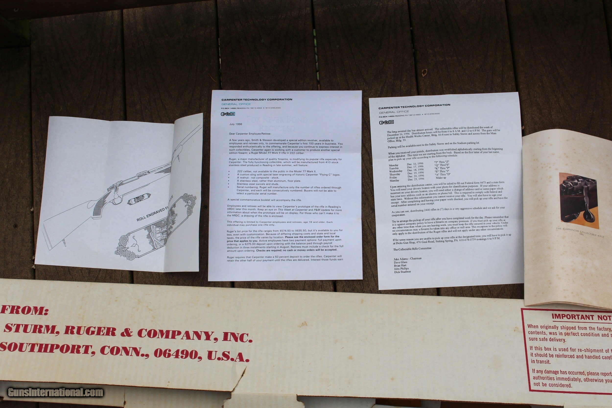 Description: RUGER MODEL 77 MARK II IN RARE, UNCATALOGUED .222 REMINGTON CALIBER!! (NOT A TYPO.... .222 REM. CALIBER!) THIS IS BRAND NEW AS ISSUED IN ORIGINAL BOX...SLING SWIVELS WERN'T EVEN PUT ON! EXTREMELY COLLECTIBLE RIFLE WAS MADE BY RUGER AS A COMMEMORATIVE ESPECIALLY FOR THE CARPENTER TECHNOLOGY CORPORATION IN READING, PA, WHO IS A SUPPLIER OF THE STAINLESS STEEL FOR RUGER BARRELS. THESE GUNS WERE MADE IN A LIMITED RUN OF 2440 PIECES, AND THIS GUN IS #2242 OF 2440. THE GUN IS ALL STAINLESS STEEL, WITH HIGH GRADE SPECIAL ENGRAVING FROM THE FACTORY. THE FLOOR PLATE IS GORGEOUS ON THIS GUN! IT COMES WITH THE RUGER FACTORY SCOPE RINGS AND A SPECIAL HAND-TOOLED LEATHER SLING WITH STAINLESS SWIVELS, WHICH IS ENGRAVED WITH THE VARIOUS COMPANY LOGOS OF CARPENTER TECHNOLOGY THROUGH THE YEARS FROM 1889 UNTIL 1996. ACCORDING TO RUGER COMPANY INFORMATION, THEY HAVE NEVER CHAMBERED ANY OTHER MODEL 77 RIFLES IN .222 REMINGTON CALIBER, SO THIS IS ONE OF THE RAREST RUGERS EVER MANUFACTURED. IF YOU ARE A RUGER COLLECTOR, THIS IS ONE YOU DON'T WANT TO PASS UP!!...UNFIRED...ANY QUESTIONS PLEASE E-MAIL SOLD |