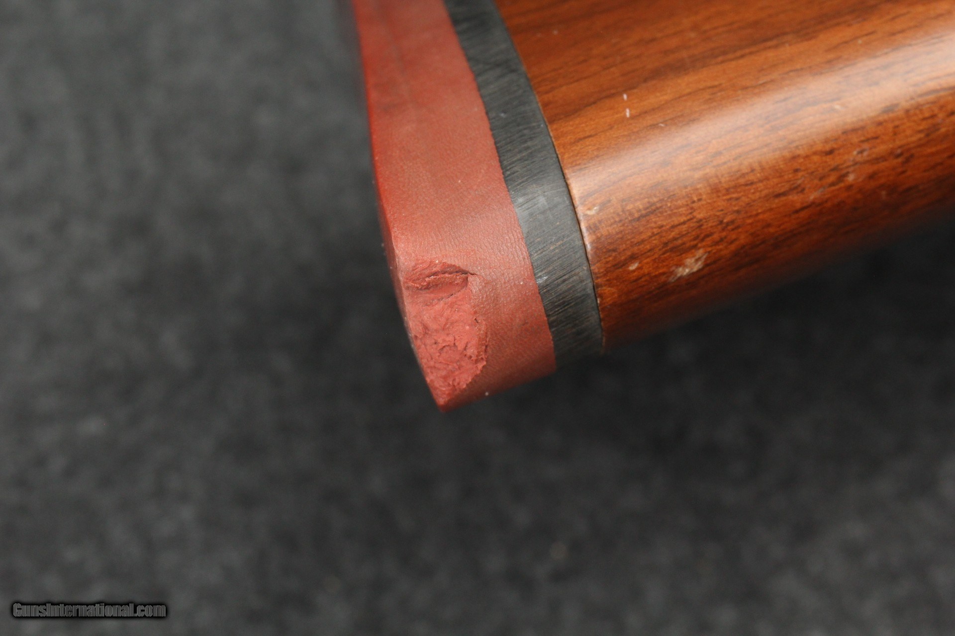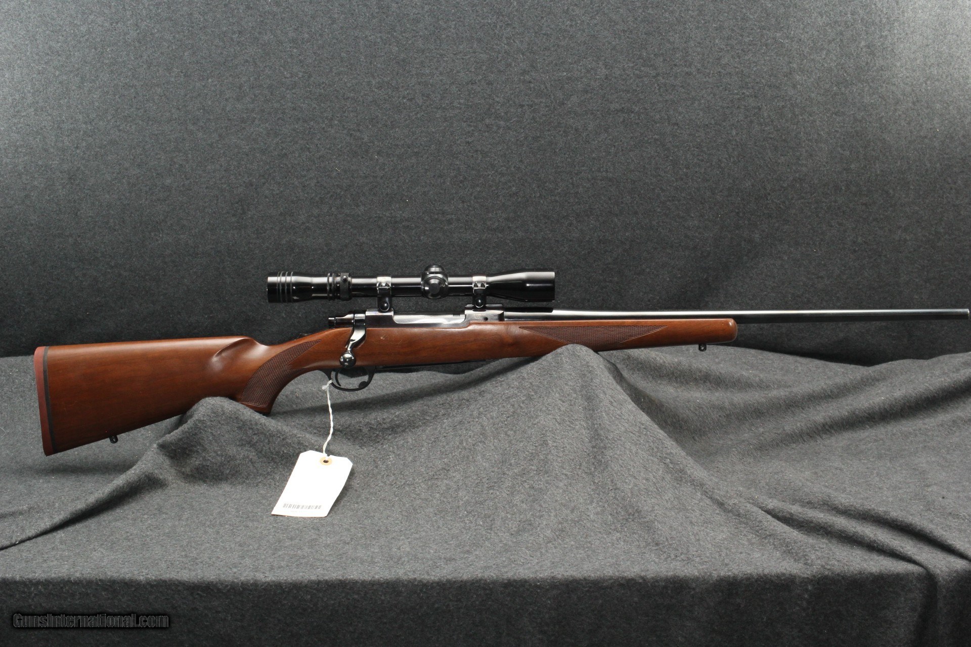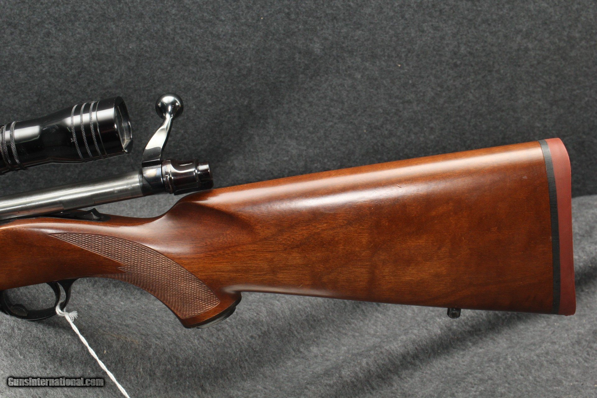 Description: 30-06, serial number 74-522XX. 22" barrel. Overall in very good condition, shows normal wear. Metal is very good, shows light wear, heavier at muzzle and underside of barrel, bore is excellent. Wood is very good, shows light marring, heavier just ahead of bolt channel on both side of stock and on buttstock. Piece of recoil pad missing from toe. Comes with older Redfield Television 3x9 scope, slight yellowing, duplex reticle (no guarantees on scope) and Ruger rings. More photos on request. Please add $50.00 for shipping and insurance. SOLD Rifle Caliber: .30-06 Springfield |