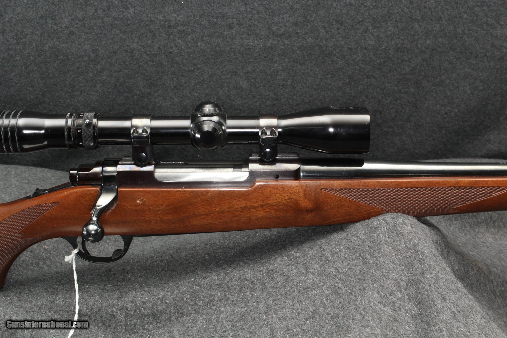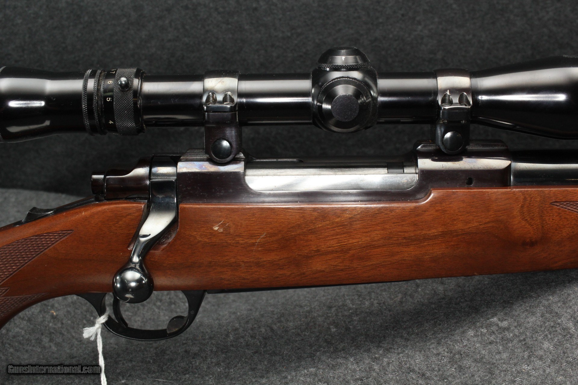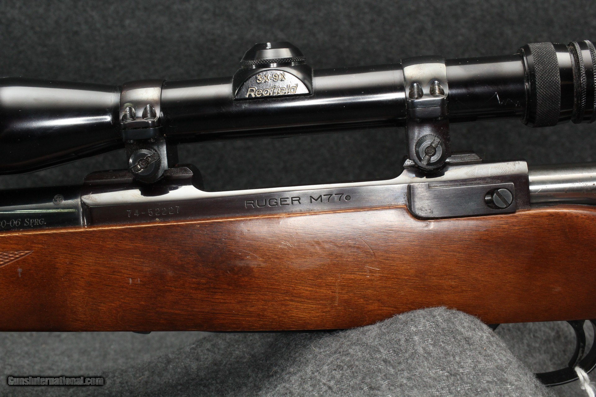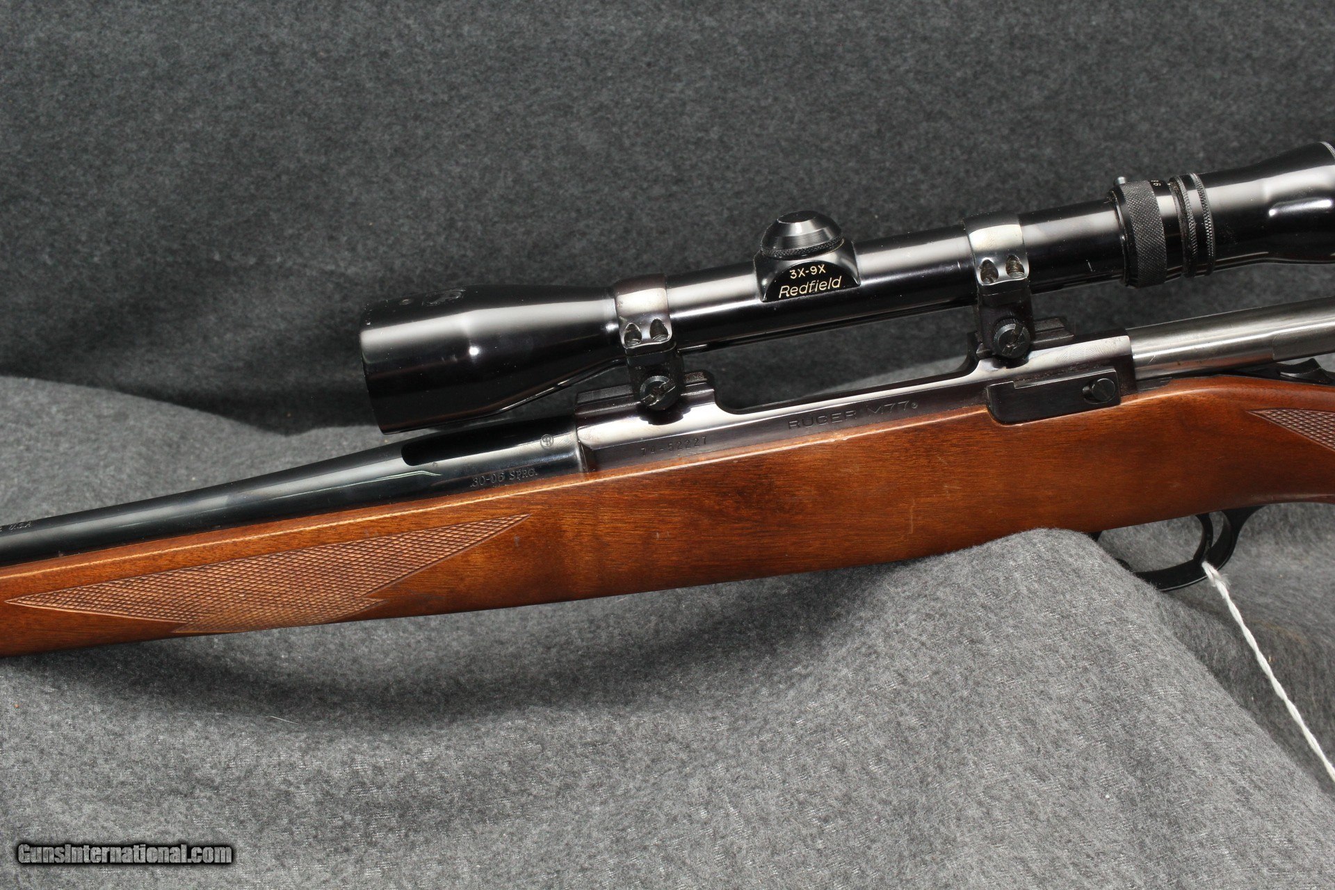 Description: 30-06, serial number 74-522XX. 22" barrel. Overall in very good condition, shows normal wear. Metal is very good, shows light wear, heavier at muzzle and underside of barrel, bore is excellent. Wood is very good, shows light marring, heavier just ahead of bolt channel on both side of stock and on buttstock. Piece of recoil pad missing from toe. Comes with older Redfield Television 3x9 scope, slight yellowing, duplex reticle (no guarantees on scope) and Ruger rings. More photos on request. Please add $50.00 for shipping and insurance. SOLD Rifle Caliber: .30-06 Springfield |
