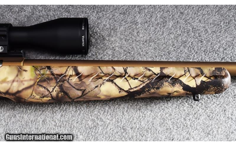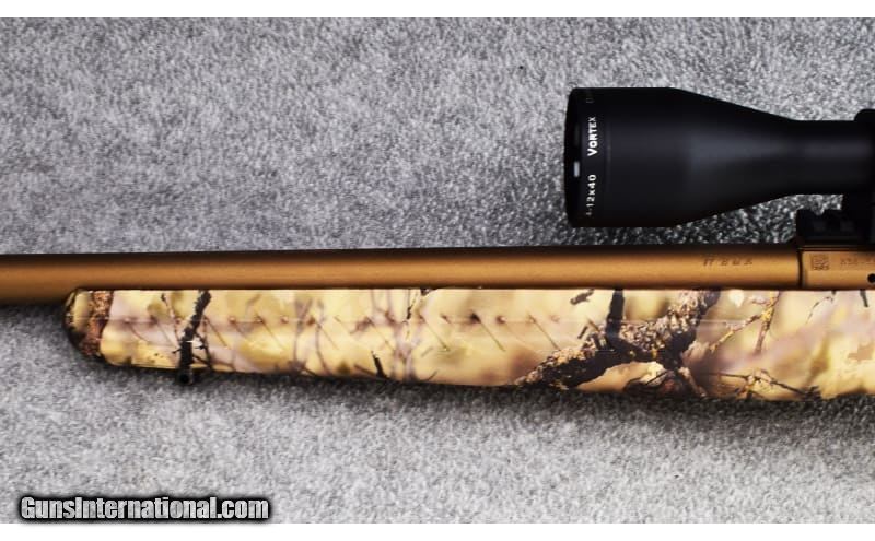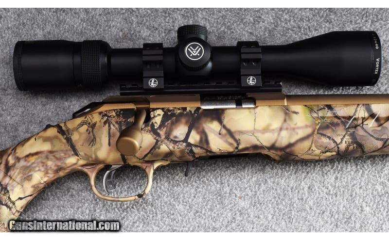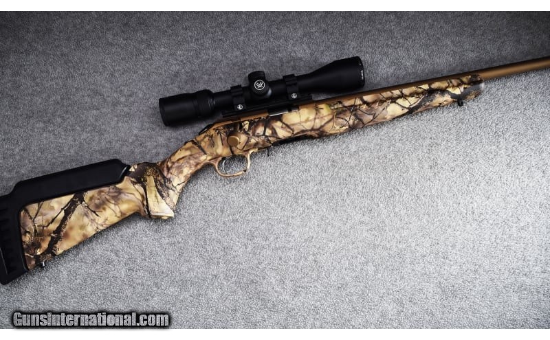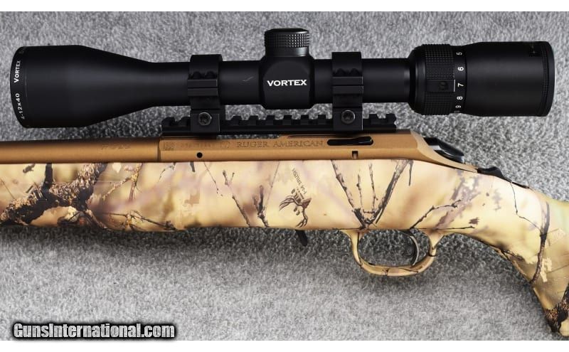 Description: This Ruger American Rimfire in 17 HMR is in excellent condition. A Vortex Diamondback 4-12x40mm scope is attached to the receiver. The barrel has a radial muzzle brake attached. All metal has a bronze color cerakote style finish. A camo stock completes this modern look. No box. One (1) factory detachable rotary magazine is furnished. .17 HMR SOLD Metal Condition: Excellent Bore Condition: Excellent Barrels: 16.5" With Muzzle Brake Triggers: Factory Adjustable Stock Dimensions: 14" LOP Fore End: Camo Synthetic Semi Pistol Grip Stock - Textured Camo Free Float Forend Butt Pad: Black Plastic Butt Plate Weight: 7 lbs Sights: Vortex Diamondback 4-12x40mm Scope Item Location: Wheeling |